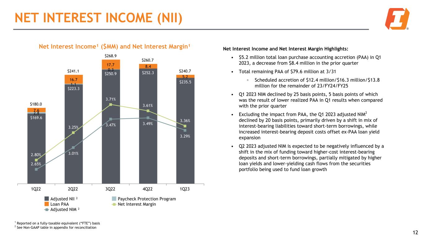 ASSET QUALITY AND RESERVE TRENDS Net Charge-offs ($MM) and Net Charge-Offs Ratio $16.7 $0.3 $12.0 $1.1 $6.2 $1.3 $15.4 0.47% 0.01% 0.27% 0.02% 0.14% 0.06% Net Charge-offs GWB Charge-offs % of Average Loans % FIBK Only 1Q22 2Q22 3Q22 4Q22 1Q23 Ongoing conservative credit management resulted in stable asset quality Total NPLs ($MM) and ACL/NPL Ratios $121.6 $109.9 $86.0 $65.6 $85.3 $20.9 $100.7 203.3% 200.5% 247.7% 335.5% 265.1% FIBK Standalone NPL GWB Acquired NPL ACL / NPL Ratio 1Q22 2Q22 3Q22 4Q22 1Q23 Criticized Loans ($MM) and Criticized Loan Ratio $853.1 $780.0 $576.9 $615.1 $621.6 $198.1 $655.0 5.0% 4.5% 3.3% 3.4% 3.4% FIBK Standalone GWB Acquired % of Total Loans 1Q22 2Q22 3Q22 4Q22 1Q23 11 Asset Quality Highlights: • Total non-performing loans at 3/31 increased by $19.7 million, or 30.0% from 12/31, primarily related to two Commercial Real Estate loans