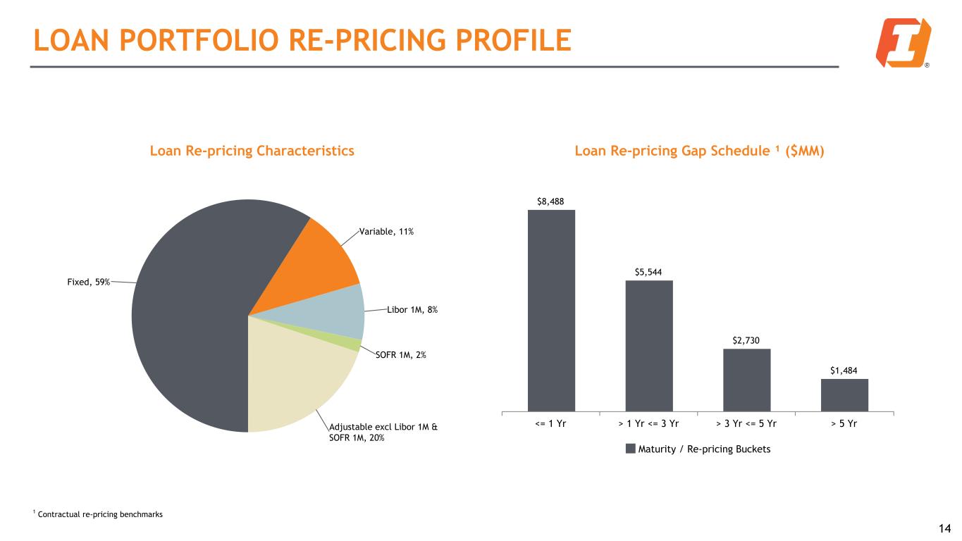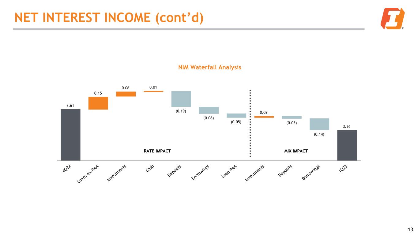 NET INTEREST INCOME (NII) Net Interest Income¹ ($MM) and Net Interest Margin¹ $180.0 $241.1 $268.9 $260.7 $240.7 $169.6 $223.3 $250.9 $252.3 $235.5 2.8 1.1 0.3 7.6 16.7 17.7 8.4 5.2 2.80% 3.25% 3.71% 3.61% 3.36% 2.65% 3.01% 3.47% 3.49% 3.29% Adjusted NII ² Paycheck Protection Program Loan PAA Net Interest Margin Adjusted NIM ² 1Q22 2Q22 3Q22 4Q22 1Q23 12 Net Interest Income and Net Interest Margin Highlights: • $5.2 million total loan purchase accounting accretion (PAA) in Q1 2023, a decrease from $8.4 million in the prior quarter • Total remaining PAA of $79.6 million at 3/31 ◦ Scheduled accretion of $12.4 million/$16.3 million/$13.8 million for the remainder of 23/FY24/FY25 • Q1 2023 NIM declined by 25 basis points, 5 basis points of which was the result of lower realized PAA in Q1 results when compared with the prior quarter • Excluding the impact from PAA, the Q1 2023 adjusted NIM2 declined by 20 basis points, primarily driven by a shift in mix of interest-bearing liabilities toward short-term borrowings, while increased interest-bearing deposit costs offset ex-PAA loan yield expansion • Q2 2023 adjusted NIM is expected to be negatively influenced by a shift in the mix of funding toward higher-cost interest-bearing deposits and short-term borrowings, partially mitigated by higher loan yields and lower-yielding cash flows from the securities portfolio being used to fund loan growth 1 Reported on a fully-taxable equivalent (“FTE”) basis 2 See Non-GAAP table in appendix for reconciliation