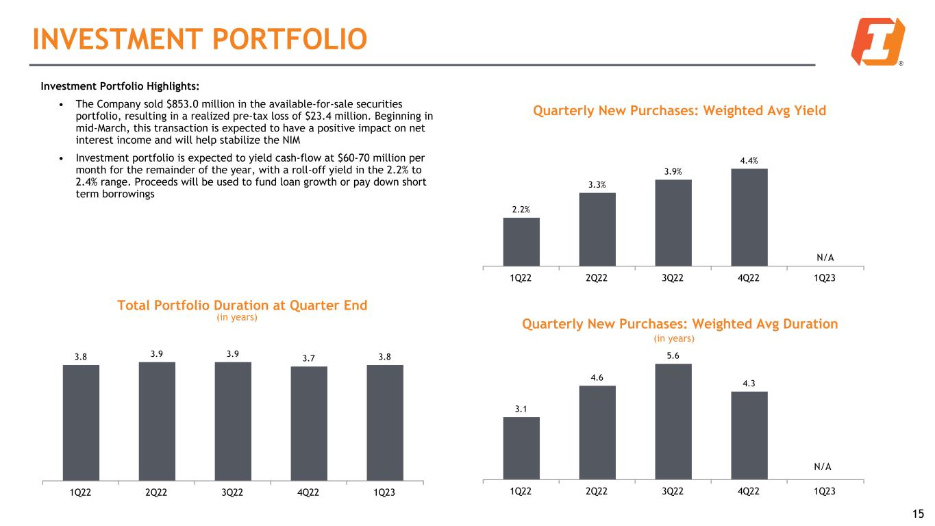 LOAN PORTFOLIO RE-PRICING PROFILE Loan Re-pricing Gap Schedule ¹ ($MM) $8,488 $5,544 $2,730 $1,484 Maturity / Re-pricing Buckets <= 1 Yr > 1 Yr <= 3 Yr > 3 Yr <= 5 Yr > 5 Yr 14 Loan Re-pricing Characteristics Fixed, 59% Variable, 11% Libor 1M, 8% SOFR 1M, 2% Adjustable excl Libor 1M & SOFR 1M, 20% 1 Contractual re-pricing benchmarks