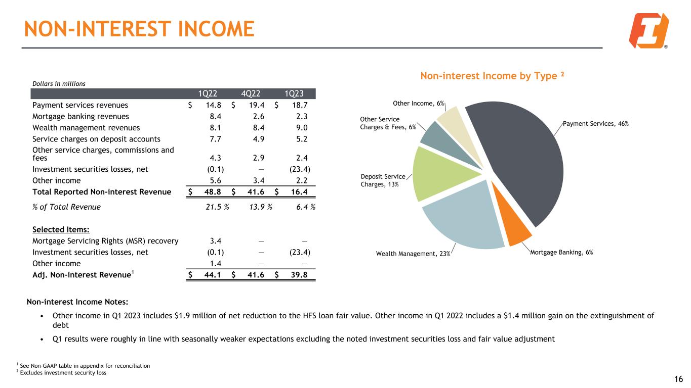 INVESTMENT PORTFOLIO Quarterly New Purchases: Weighted Avg Yield 2.2% 3.3% 3.9% 4.4% 1Q22 2Q22 3Q22 4Q22 1Q23 15 Investment Portfolio Highlights: • The Company sold $853.0 million in the available-for-sale securities portfolio, resulting in a realized pre-tax loss of $23.4 million. Beginning in mid-March, this transaction is expected to have a positive impact on net interest income and will help stabilize the NIM • Investment portfolio is expected to yield cash-flow at $60-70 million per month for the remainder of the year, with a roll-off yield in the 2.2% to 2.4% range. Proceeds will be used to fund loan growth or pay down short term borrowings Quarterly New Purchases: Weighted Avg Duration 3.1 4.6 5.6 4.3 3.1 4.6 5.6 4.3 1Q22 2Q22 3Q22 4Q22 1Q23 Total Portfolio Duration at Quarter End 3.8 3.9 3.9 3.7 3.8 1Q22 2Q22 3Q22 4Q22 1Q23 N/A N/A (in years) (in years)