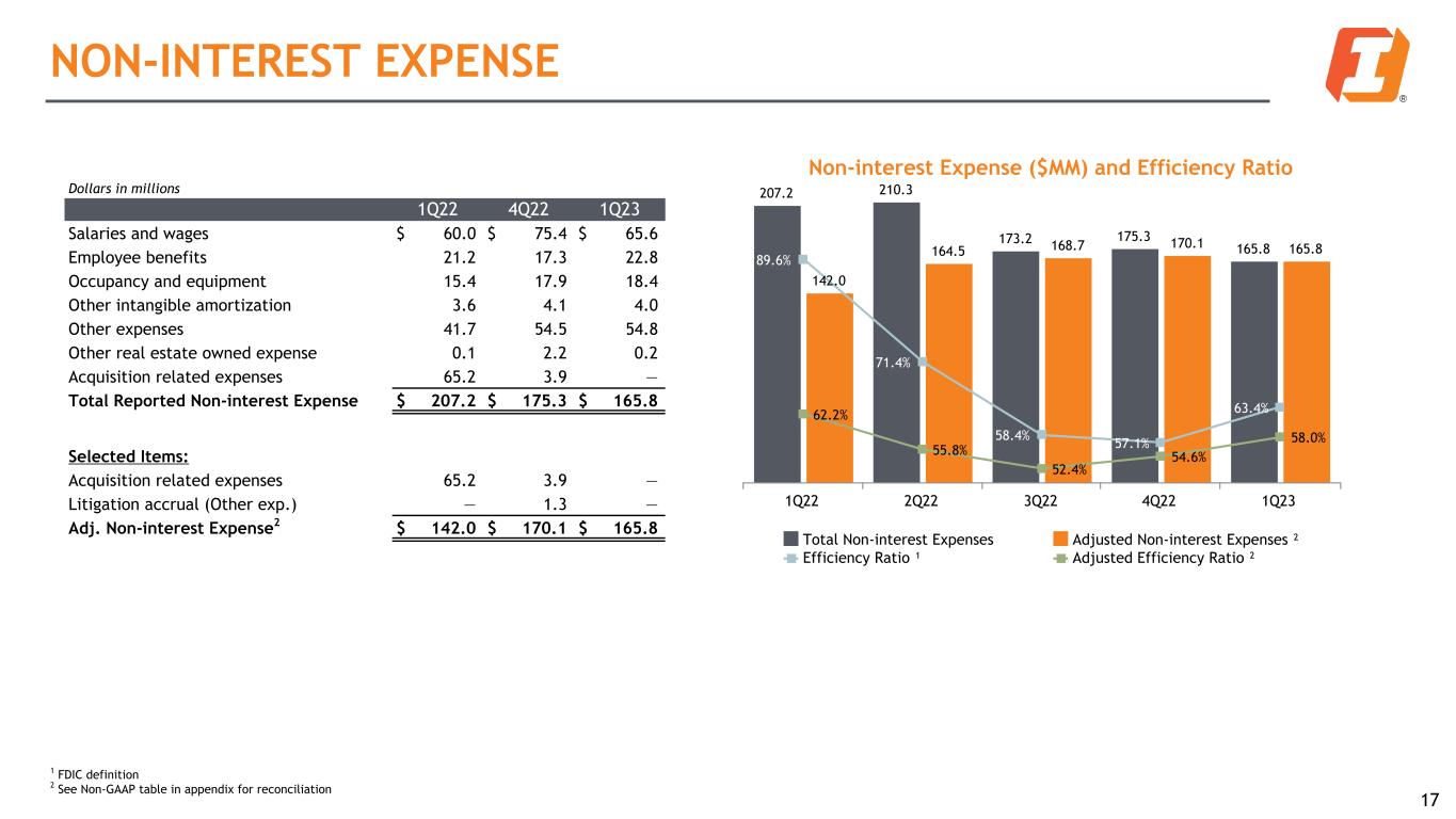 16 Non-interest Income by Type ² Payment Services, 46% Mortgage Banking, 6%Wealth Management, 23% Deposit Service Charges, 13% Other Service Charges & Fees, 6% Other Income, 6% Dollars in millions 1Q22 4Q22 1Q23 Payment services revenues $ 14.8 $ 19.4 $ 18.7 Mortgage banking revenues 8.4 2.6 2.3 Wealth management revenues 8.1 8.4 9.0 Service charges on deposit accounts 7.7 4.9 5.2 Other service charges, commissions and fees 4.3 2.9 2.4 Investment securities losses, net (0.1) — (23.4) Other income 5.6 3.4 2.2 Total Reported Non-interest Revenue $ 48.8 $ 41.6 $ 16.4 % of Total Revenue 21.5 % 13.9 % 6.4 % Selected Items: Mortgage Servicing Rights (MSR) recovery 3.4 — — Investment securities losses, net (0.1) — (23.4) Other income 1.4 — — Adj. Non-interest Revenue1 $ 44.1 $ 41.6 $ 39.8 Non-interest Income Notes: • Other income in Q1 2023 includes $1.9 million of net reduction to the HFS loan fair value. Other income in Q1 2022 includes a $1.4 million gain on the extinguishment of debt • Q1 results were roughly in line with seasonally weaker expectations excluding the noted investment securities loss and fair value adjustment NON-INTEREST INCOME 1 See Non-GAAP table in appendix for reconciliation 2 Excludes investment security loss