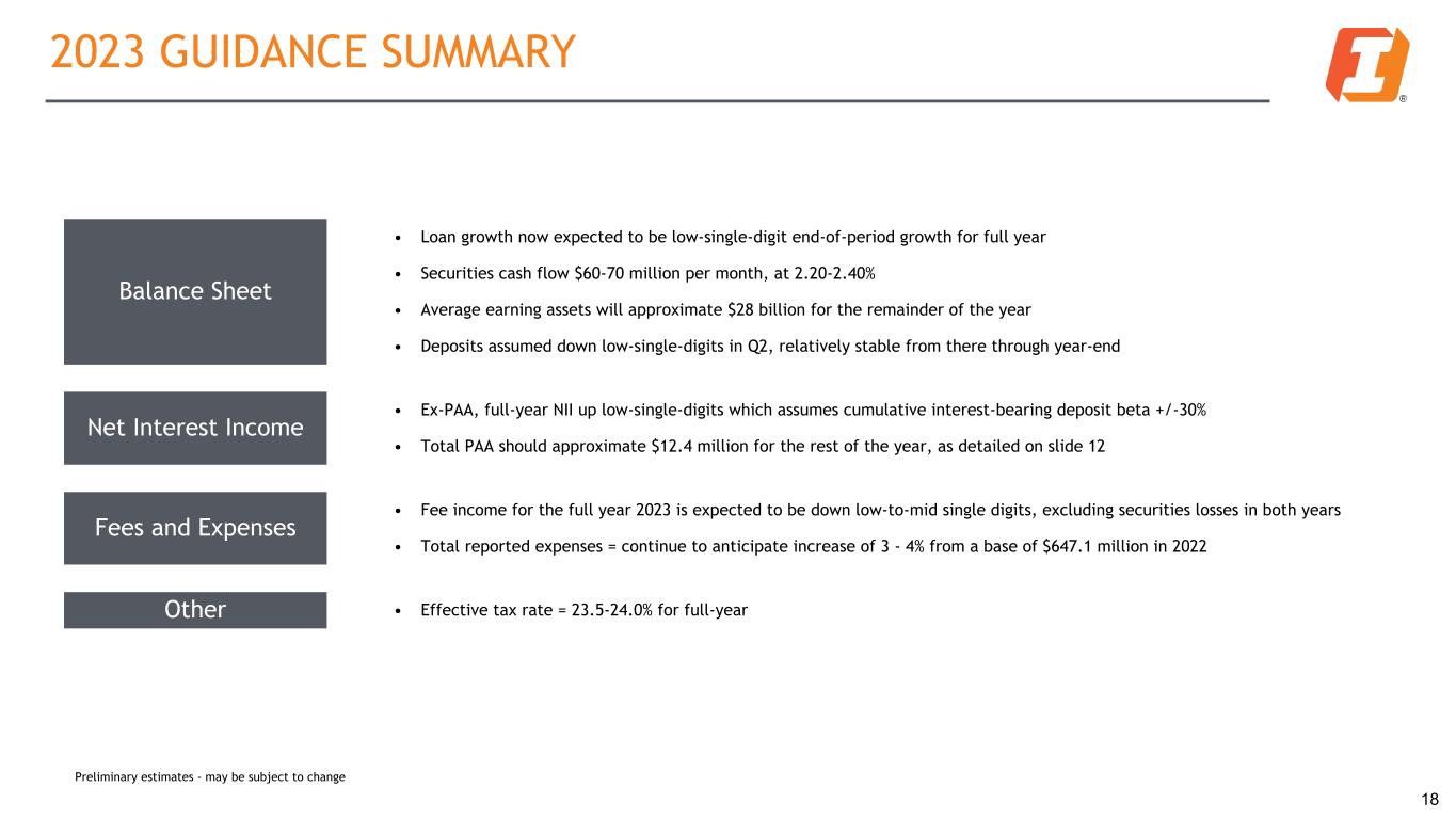 NON-INTEREST EXPENSE 17 Dollars in millions 1Q22 4Q22 1Q23 Salaries and wages $ 60.0 $ 75.4 $ 65.6 Employee benefits 21.2 17.3 22.8 Occupancy and equipment 15.4 17.9 18.4 Other intangible amortization 3.6 4.1 4.0 Other expenses 41.7 54.5 54.8 Other real estate owned expense 0.1 2.2 0.2 Acquisition related expenses 65.2 3.9 — Total Reported Non-interest Expense $ 207.2 $ 175.3 $ 165.8 Selected Items: Acquisition related expenses 65.2 3.9 — Litigation accrual (Other exp.) — 1.3 — Adj. Non-interest Expense2 $ 142.0 $ 170.1 $ 165.8 Non-interest Expense ($MM) and Efficiency Ratio 207.2 210.3 173.2 175.3 165.8 142.0 164.5 168.7 170.1 165.8 89.6% 71.4% 58.4% 57.1% 63.4%62.2% 55.8% 52.4% 54.6% 58.0% Total Non-interest Expenses Adjusted Non-interest Expenses ² Efficiency Ratio ¹ Adjusted Efficiency Ratio ² 1Q22 2Q22 3Q22 4Q22 1Q23 1 FDIC definition 2 See Non-GAAP table in appendix for reconciliation