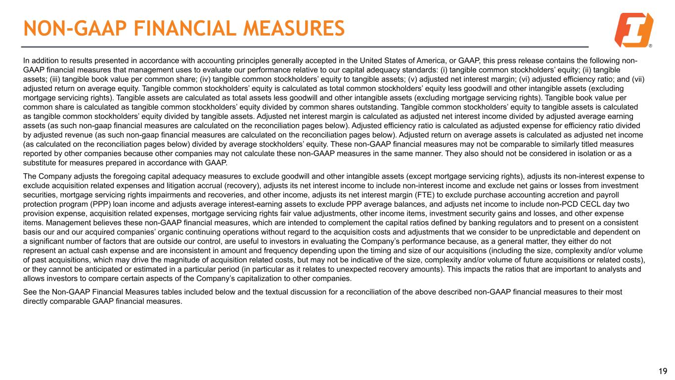 NON-GAAP FINANCIAL MEASURES 19 In addition to results presented in accordance with accounting principles generally accepted in the United States of America, or GAAP, this press release contains the following non- GAAP financial measures that management uses to evaluate our performance relative to our capital adequacy standards: (i) tangible common stockholders’ equity; (ii) tangible assets; (iii) tangible book value per common share; (iv) tangible common stockholders’ equity to tangible assets; (v) adjusted net interest margin; (vi) adjusted efficiency ratio; and (vii) adjusted return on average equity. Tangible common stockholders’ equity is calculated as total common stockholders’ equity less goodwill and other intangible assets (excluding mortgage servicing rights). Tangible assets are calculated as total assets less goodwill and other intangible assets (excluding mortgage servicing rights). Tangible book value per common share is calculated as tangible common stockholders’ equity divided by common shares outstanding. Tangible common stockholders’ equity to tangible assets is calculated as tangible common stockholders’ equity divided by tangible assets. Adjusted net interest margin is calculated as adjusted net interest income divided by adjusted average earning assets (as such non-gaap financial measures are calculated on the reconciliation pages below). Adjusted efficiency ratio is calculated as adjusted expense for efficiency ratio divided by adjusted revenue (as such non-gaap financial measures are calculated on the reconciliation pages below). Adjusted return on average assets is calculated as adjusted net income (as calculated on the reconciliation pages below) divided by average stockholders’ equity. These non-GAAP financial measures may not be comparable to similarly titled measures reported by other companies because other companies may not calculate these non-GAAP measures in the same manner. They also should not be considered in isolation or as a substitute for measures prepared in accordance with GAAP. The Company adjusts the foregoing capital adequacy measures to exclude goodwill and other intangible assets (except mortgage servicing rights), adjusts its non-interest expense to exclude acquisition related expenses and litigation accrual (recovery), adjusts its net interest income to include non-interest income and exclude net gains or losses from investment securities, mortgage servicing rights impairments and recoveries, and other income, adjusts its net interest margin (FTE) to exclude purchase accounting accretion and payroll protection program (PPP) loan income and adjusts average interest-earning assets to exclude PPP average balances, and adjusts net income to include non-PCD CECL day two provision expense, acquisition related expenses, mortgage servicing rights fair value adjustments, other income items, investment security gains and losses, and other expense items. Management believes these non-GAAP financial measures, which are intended to complement the capital ratios defined by banking regulators and to present on a consistent basis our and our acquired companies’ organic continuing operations without regard to the acquisition costs and adjustments that we consider to be unpredictable and dependent on a significant number of factors that are outside our control, are useful to investors in evaluating the Company’s performance because, as a general matter, they either do not represent an actual cash expense and are inconsistent in amount and frequency depending upon the timing and size of our acquisitions (including the size, complexity and/or volume of past acquisitions, which may drive the magnitude of acquisition related costs, but may not be indicative of the size, complexity and/or volume of future acquisitions or related costs), or they cannot be anticipated or estimated in a particular period (in particular as it relates to unexpected recovery amounts). This impacts the ratios that are important to analysts and allows investors to compare certain aspects of the Company’s capitalization to other companies. See the Non-GAAP Financial Measures tables included below and the textual discussion for a reconciliation of the above described non-GAAP financial measures to their most directly comparable GAAP financial measures.