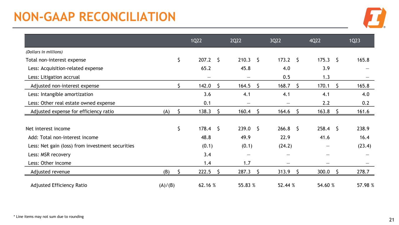 1Q22 2Q22 3Q22 4Q22 1Q23 (Dollars in millions) Total common stockholders' equity (GAAP) (A) $ 3,441.1 $ 3,271.9 $ 3,005.5 $ 3,073.8 $ 3,160.3 Less goodwill and other intangible assets (excluding mortgage servicing rights) 1,275.2 1,232.9 1,229.0 1,225.9 1,221.9 Tangible common stockholders' equity (Non-GAAP) (B) $ 2,165.9 $ 2,039.0 $ 1,776.5 $ 1,847.9 $ 1,938.4 Total assets (GAAP) $ 33,162.2 $ 32,061.8 $ 31,344.7 $ 32,287.8 $ 31,637.7 Less goodwill and other intangible assets (excluding mortgage servicing rights) 1,275.2 1,232.9 1,229.0 1,225.9 1,221.9 Tangible assets (Non-GAAP) (C) $ 31,887.0 $ 30,828.9 $ 30,115.7 $ 31,061.9 $ 30,415.8 Common shares outstanding (L) 109,503 107,758 104,451 104,442 104,382 Book value per common share (GAAP) (A) / (L) $ 31.42 $ 30.36 $ 28.77 $ 29.43 $ 30.28 Tangible book value per common share (Non-GAAP) (B) / (L) 19.78 18.92 17.01 17.69 18.57 Tangible common stockholders' equity to tangible assets (Non-GAAP) (B) / (C) 6.79 % 6.61 % 5.90 % 5.95 % 6.37 % NON-GAAP RECONCILIATION 20 * Line items may not sum due to rounding