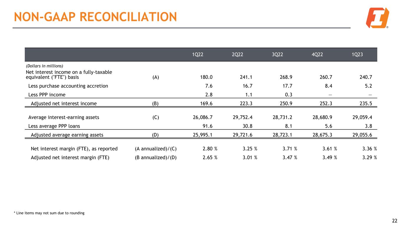1Q22 2Q22 3Q22 4Q22 1Q23 (Dollars in millions) Total non-interest expense $ 207.2 $ 210.3 $ 173.2 $ 175.3 $ 165.8 Less: Acquisition-related expense 65.2 45.8 4.0 3.9 — Less: Litigation accrual — — 0.5 1.3 — Adjusted non-interest expense $ 142.0 $ 164.5 $ 168.7 $ 170.1 $ 165.8 Less: Intangible amortization 3.6 4.1 4.1 4.1 4.0 Less: Other real estate owned expense 0.1 — — 2.2 0.2 Adjusted expense for efficiency ratio (A) $ 138.3 $ 160.4 $ 164.6 $ 163.8 $ 161.6 Net interest income $ 178.4 $ 239.0 $ 266.8 $ 258.4 $ 238.9 Add: Total non-interest income 48.8 49.9 22.9 41.6 16.4 Less: Net gain (loss) from investment securities (0.1) (0.1) (24.2) — (23.4) Less: MSR recovery 3.4 — — — — Less: Other income 1.4 1.7 — — — Adjusted revenue (B) $ 222.5 $ 287.3 $ 313.9 $ 300.0 $ 278.7 Adjusted Efficiency Ratio (A)/(B) 62.16 % 55.83 % 52.44 % 54.60 % 57.98 % NON-GAAP RECONCILIATION 21 * Line items may not sum due to rounding