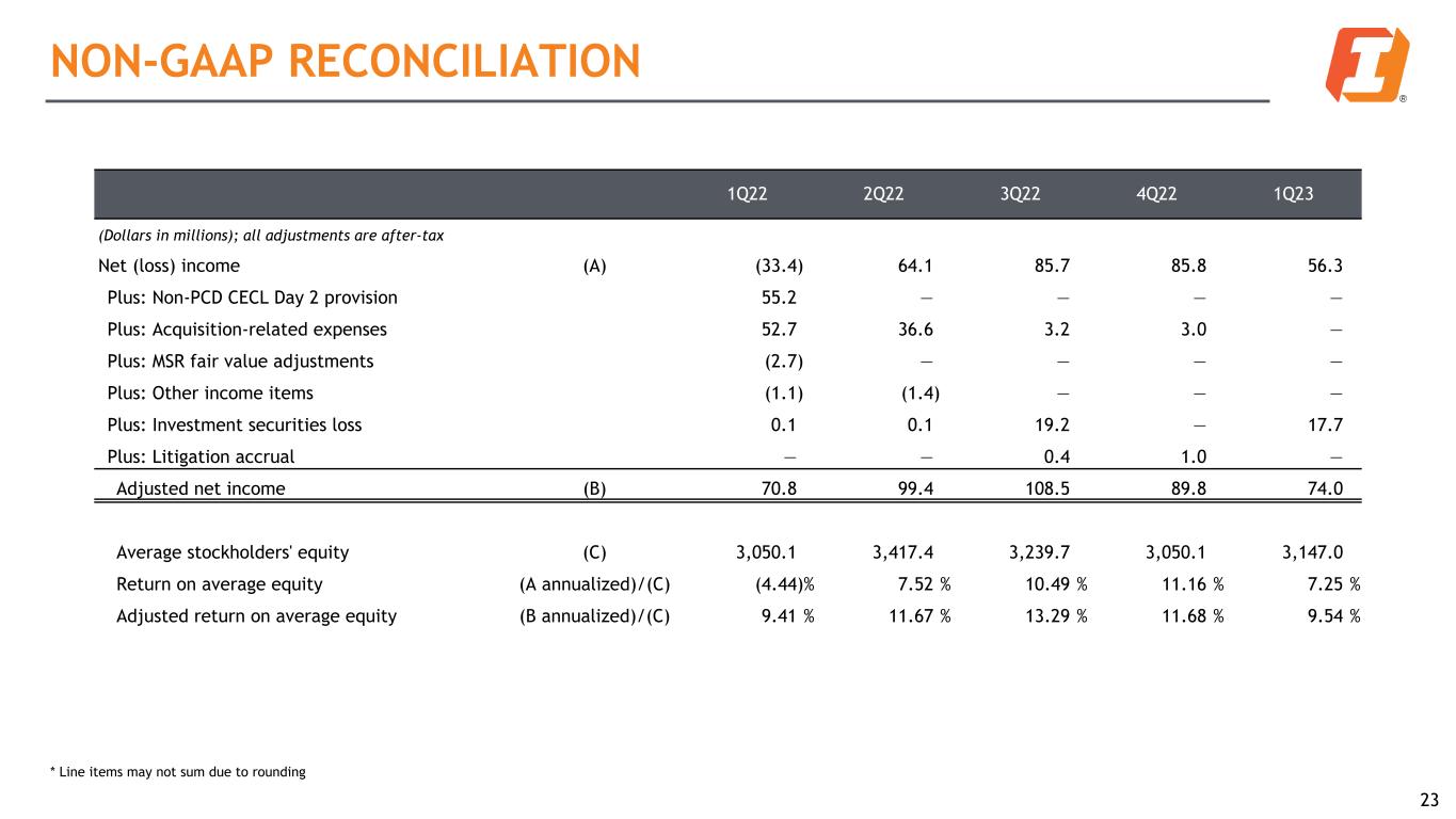 1Q22 2Q22 3Q22 4Q22 1Q23 (Dollars in millions) Net interest income on a fully-taxable equivalent ("FTE") basis (A) 180.0 241.1 268.9 260.7 240.7 Less purchase accounting accretion 7.6 16.7 17.7 8.4 5.2 Less PPP income 2.8 1.1 0.3 — — Adjusted net interest income (B) 169.6 223.3 250.9 252.3 235.5 Average interest-earning assets (C) 26,086.7 29,752.4 28,731.2 28,680.9 29,059.4 Less average PPP loans 91.6 30.8 8.1 5.6 3.8 Adjusted average earning assets (D) 25,995.1 29,721.6 28,723.1 28,675.3 29,055.6 Net interest margin (FTE), as reported (A annualized)/(C) 2.80 % 3.25 % 3.71 % 3.61 % 3.36 % Adjusted net interest margin (FTE) (B annualized)/(D) 2.65 % 3.01 % 3.47 % 3.49 % 3.29 % NON-GAAP RECONCILIATION 22 * Line items may not sum due to rounding