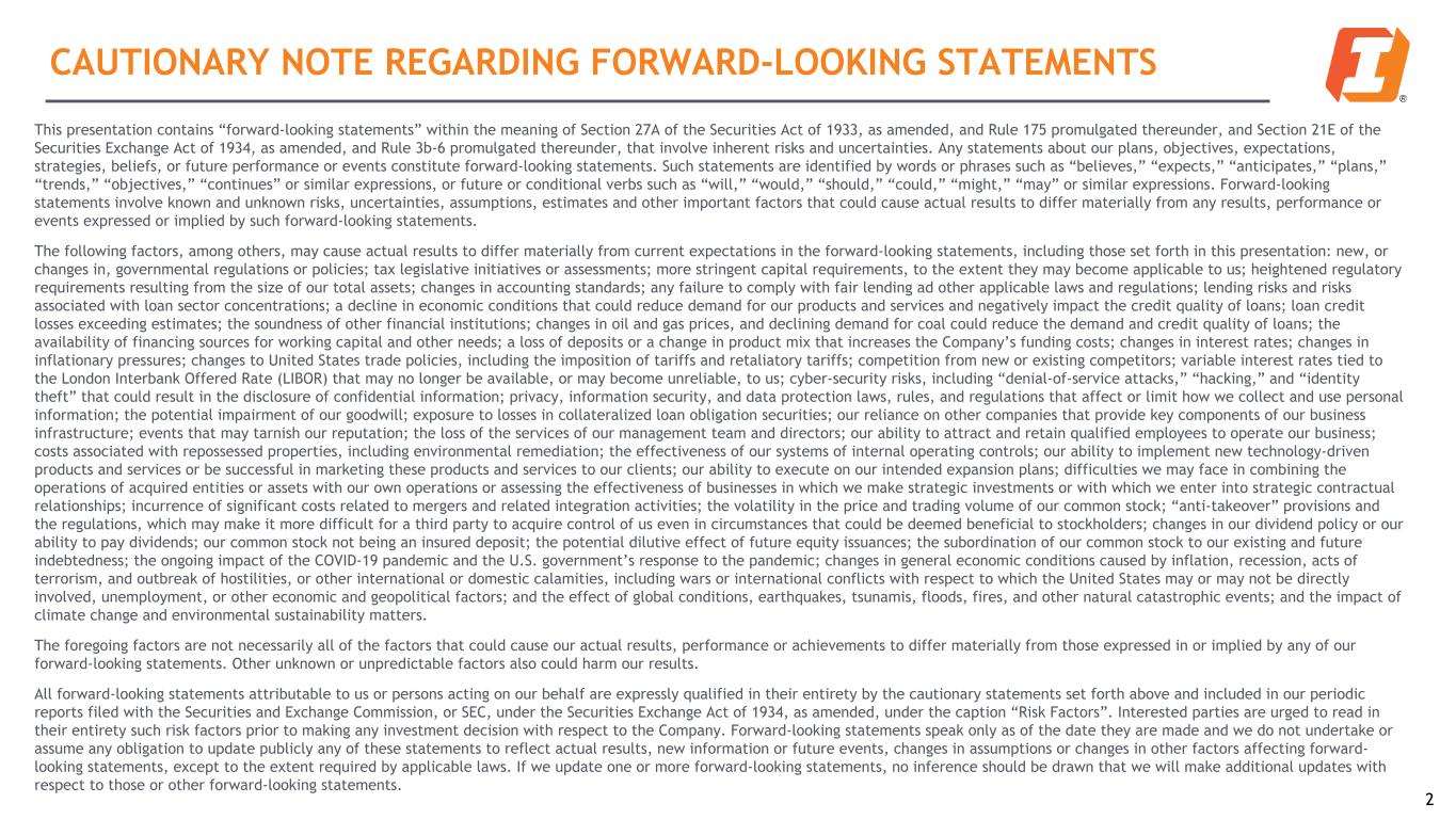 CAUTIONARY NOTE REGARDING FORWARD-LOOKING STATEMENTS 2 This presentation contains “forward-looking statements” within the meaning of Section 27A of the Securities Act of 1933, as amended, and Rule 175 promulgated thereunder, and Section 21E of the Securities Exchange Act of 1934, as amended, and Rule 3b-6 promulgated thereunder, that involve inherent risks and uncertainties. Any statements about our plans, objectives, expectations, strategies, beliefs, or future performance or events constitute forward-looking statements. Such statements are identified by words or phrases such as “believes,” “expects,” “anticipates,” “plans,” “trends,” “objectives,” “continues” or similar expressions, or future or conditional verbs such as “will,” “would,” “should,” “could,” “might,” “may” or similar expressions. Forward-looking statements involve known and unknown risks, uncertainties, assumptions, estimates and other important factors that could cause actual results to differ materially from any results, performance or events expressed or implied by such forward-looking statements. The following factors, among others, may cause actual results to differ materially from current expectations in the forward-looking statements, including those set forth in this presentation: new, or changes in, governmental regulations or policies; tax legislative initiatives or assessments; more stringent capital requirements, to the extent they may become applicable to us; heightened regulatory requirements resulting from the size of our total assets; changes in accounting standards; any failure to comply with fair lending ad other applicable laws and regulations; lending risks and risks associated with loan sector concentrations; a decline in economic conditions that could reduce demand for our products and services and negatively impact the credit quality of loans; loan credit losses exceeding estimates; the soundness of other financial institutions; changes in oil and gas prices, and declining demand for coal could reduce the demand and credit quality of loans; the availability of financing sources for working capital and other needs; a loss of deposits or a change in product mix that increases the Company’s funding costs; changes in interest rates; changes in inflationary pressures; changes to United States trade policies, including the imposition of tariffs and retaliatory tariffs; competition from new or existing competitors; variable interest rates tied to the London Interbank Offered Rate (LIBOR) that may no longer be available, or may become unreliable, to us; cyber-security risks, including “denial-of-service attacks,” “hacking,” and “identity theft” that could result in the disclosure of confidential information; privacy, information security, and data protection laws, rules, and regulations that affect or limit how we collect and use personal information; the potential impairment of our goodwill; exposure to losses in collateralized loan obligation securities; our reliance on other companies that provide key components of our business infrastructure; events that may tarnish our reputation; the loss of the services of our management team and directors; our ability to attract and retain qualified employees to operate our business; costs associated with repossessed properties, including environmental remediation; the effectiveness of our systems of internal operating controls; our ability to implement new technology-driven products and services or be successful in marketing these products and services to our clients; our ability to execute on our intended expansion plans; difficulties we may face in combining the operations of acquired entities or assets with our own operations or assessing the effectiveness of businesses in which we make strategic investments or with which we enter into strategic contractual relationships; incurrence of significant costs related to mergers and related integration activities; the volatility in the price and trading volume of our common stock; “anti-takeover” provisions and the regulations, which may make it more difficult for a third party to acquire control of us even in circumstances that could be deemed beneficial to stockholders; changes in our dividend policy or our ability to pay dividends; our common stock not being an insured deposit; the potential dilutive effect of future equity issuances; the subordination of our common stock to our existing and future indebtedness; the ongoing impact of the COVID-19 pandemic and the U.S. government’s response to the pandemic; changes in general economic conditions caused by inflation, recession, acts of terrorism, and outbreak of hostilities, or other international or domestic calamities, including wars or international conflicts with respect to which the United States may or may not be directly involved, unemployment, or other economic and geopolitical factors; and the effect of global conditions, earthquakes, tsunamis, floods, fires, and other natural catastrophic events; and the impact of climate change and environmental sustainability matters. The foregoing factors are not necessarily all of the factors that could cause our actual results, performance or achievements to differ materially from those expressed in or implied by any of our forward-looking statements. Other unknown or unpredictable factors also could harm our results. All forward-looking statements attributable to us or persons acting on our behalf are expressly qualified in their entirety by the cautionary statements set forth above and included in our periodic reports filed with the Securities and Exchange Commission, or SEC, under the Securities Exchange Act of 1934, as amended, under the caption “Risk Factors”. Interested parties are urged to read in their entirety such risk factors prior to making any investment decision with respect to the Company. Forward-looking statements speak onl