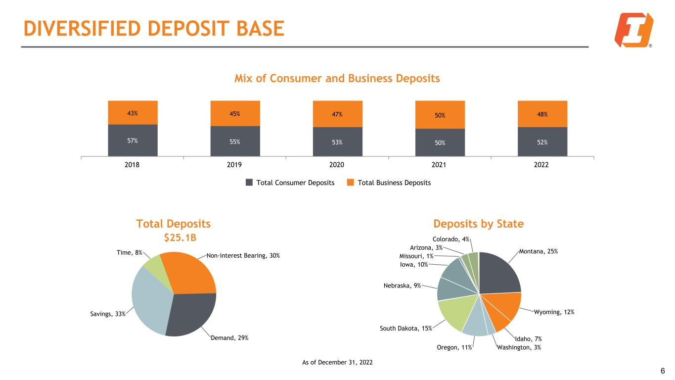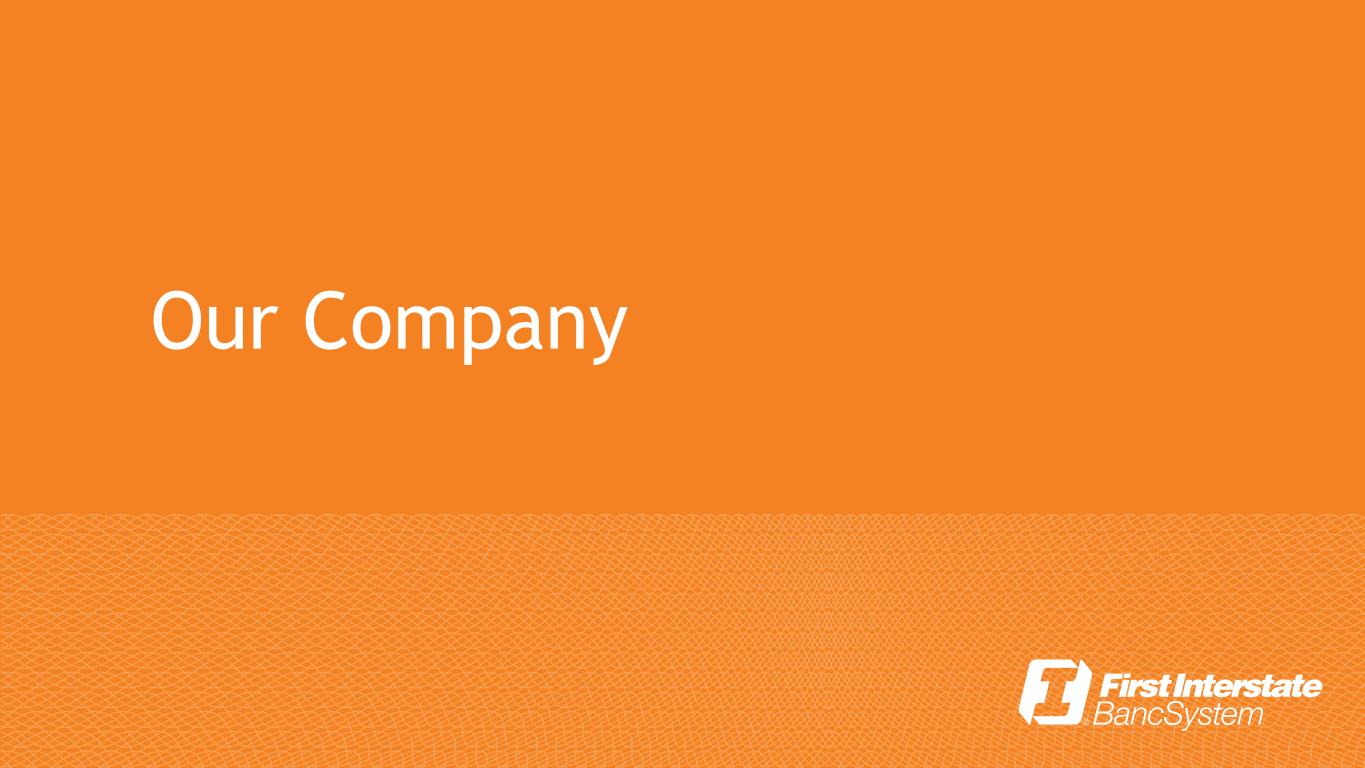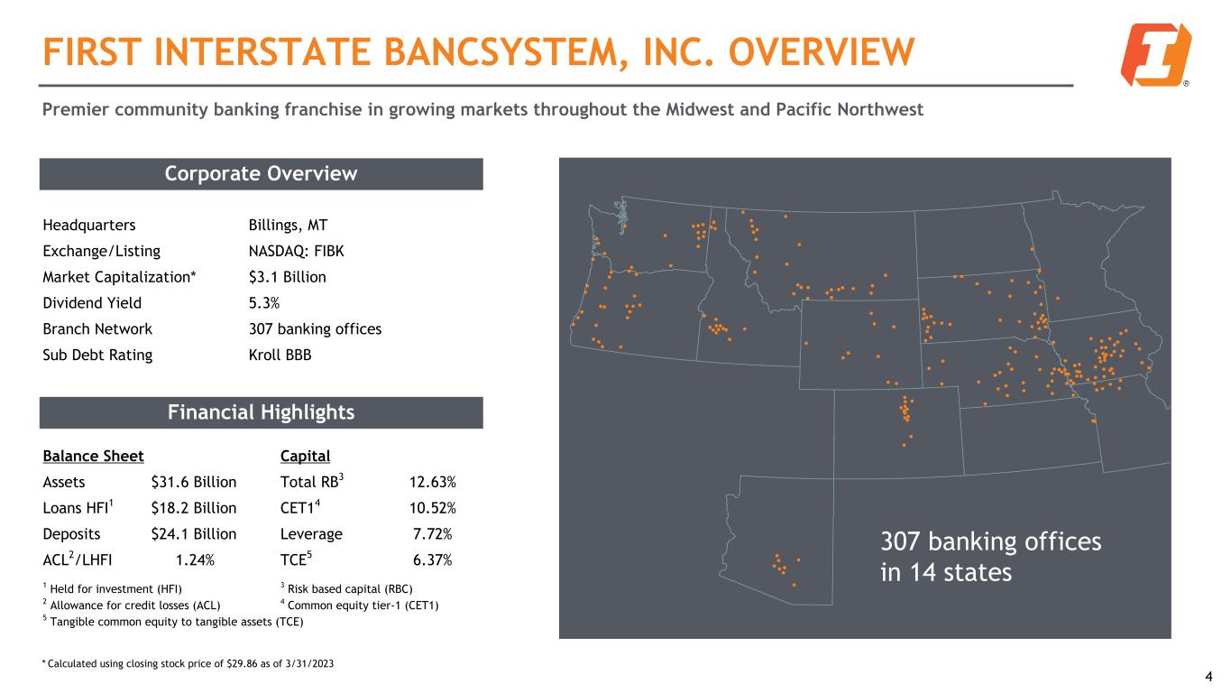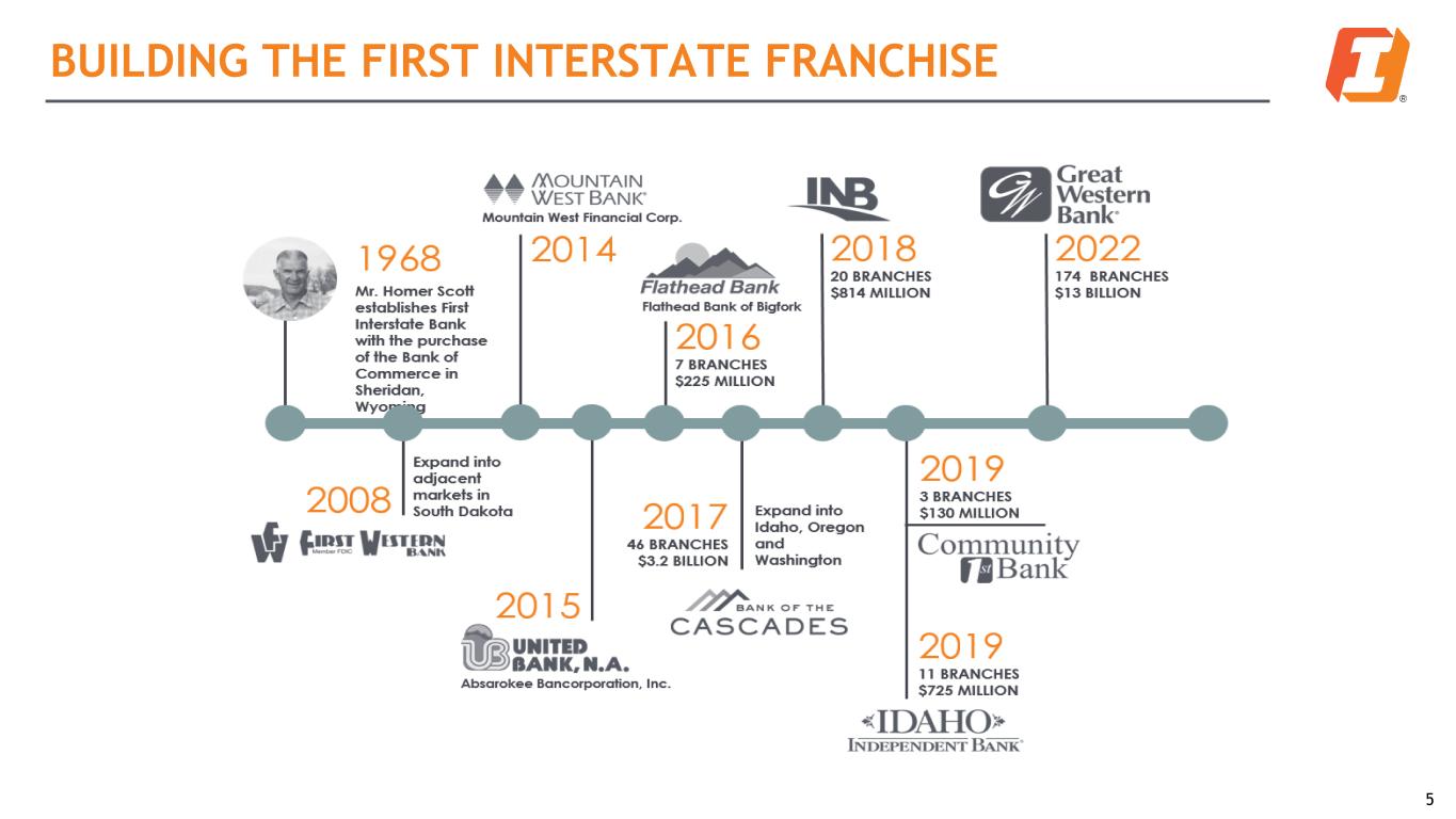 FIRST INTERSTATE BANCSYSTEM, INC. OVERVIEW Premier community banking franchise in growing markets throughout the Midwest and Pacific Northwest Corporate Overview Headquarters Billings, MT Exchange/Listing NASDAQ: FIBK Market Capitalization* $3.1 Billion Dividend Yield 5.3% Branch Network 307 banking offices Sub Debt Rating Kroll BBB Financial Highlights Balance Sheet Capital Assets $31.6 Billion Total RB3 12.63% Loans HFI1 $18.2 Billion CET14 10.52% Deposits $24.1 Billion Leverage 7.72% ACL2/LHFI 1.24% TCE5 6.37% 1 Held for investment (HFI) 3 Risk based capital (RBC) 2 Allowance for credit losses (ACL) 4 Common equity tier-1 (CET1) 5 Tangible common equity to tangible assets (TCE) 4 307 banking offices in 14 states * Calculated using closing stock price of $29.86 as of 3/31/2023