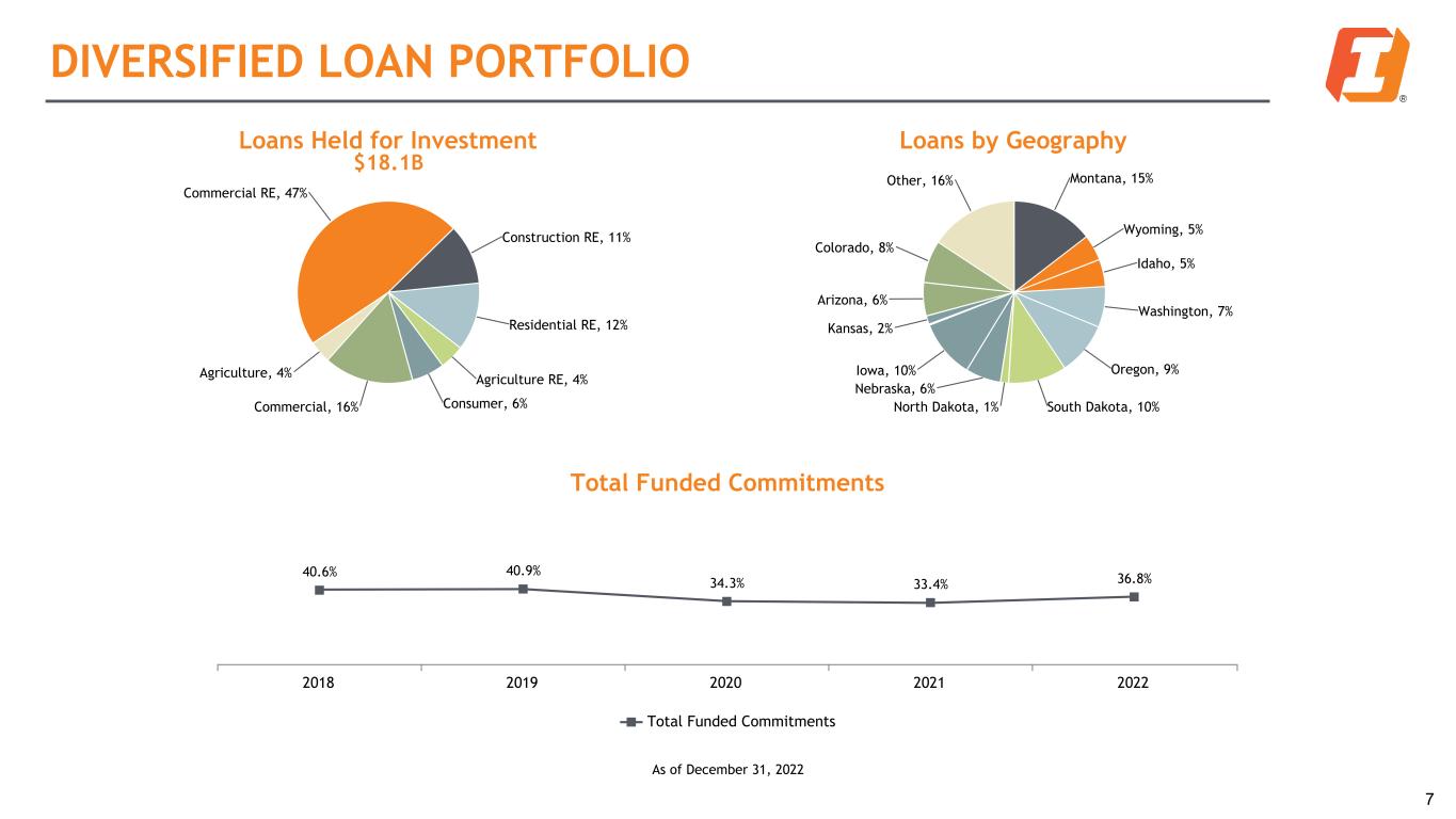 DIVERSIFIED DEPOSIT BASE Total Deposits Non-interest Bearing, 30% Demand, 29% Savings, 33% Time, 8% Deposits by State Montana, 25% Wyoming, 12% Idaho, 7% Washington, 3%Oregon, 11% South Dakota, 15% Nebraska, 9% Iowa, 10% Missouri, 1% Arizona, 3% Colorado, 4% Mix of Consumer and Business Deposits 57% 55% 53% 50% 52% 43% 45% 47% 50% 48% Total Consumer Deposits Total Business Deposits 2018 2019 2020 2021 2022 6 $25.1B As of December 31, 2022