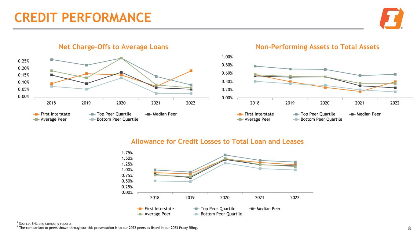 DIVERSIFIED LOAN PORTFOLIO Loans Held for Investment Commercial RE, 47% Construction RE, 11% Residential RE, 12% Agriculture RE, 4% Consumer, 6%Commercial, 16% Agriculture, 4% Loans by Geography Montana, 15% Wyoming, 5% Idaho, 5% Washington, 7% Oregon, 9% South Dakota, 10%North Dakota, 1% Nebraska, 6% Iowa, 10% Kansas, 2% Arizona, 6% Colorado, 8% Other, 16% Total Funded Commitments 40.6% 40.9% 34.3% 33.4% 36.8% Total Funded Commitments 2018 2019 2020 2021 2022 7 $18.1B As of December 31, 2022