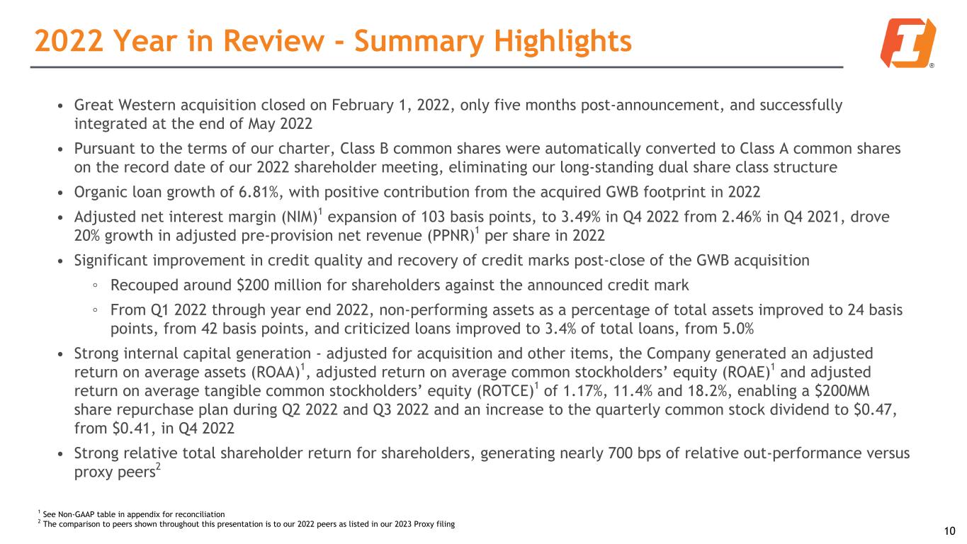 2022 Year in Review - Summary Highlights 10 • Great Western acquisition closed on February 1, 2022, only five months post-announcement, and successfully integrated at the end of May 2022 • Pursuant to the terms of our charter, Class B common shares were automatically converted to Class A common shares on the record date of our 2022 shareholder meeting, eliminating our long-standing dual share class structure • Organic loan growth of 6.81%, with positive contribution from the acquired GWB footprint in 2022 • Adjusted net interest margin (NIM)1 expansion of 103 basis points, to 3.49% in Q4 2022 from 2.46% in Q4 2021, drove 20% growth in adjusted pre-provision net revenue (PPNR)1 per share in 2022 • Significant improvement in credit quality and recovery of credit marks post-close of the GWB acquisition ◦ Recouped around $200 million for shareholders against the announced credit mark ◦ From Q1 2022 through year end 2022, non-performing assets as a percentage of total assets improved to 24 basis points, from 42 basis points, and criticized loans improved to 3.4% of total loans, from 5.0% • Strong internal capital generation - adjusted for acquisition and other items, the Company generated an adjusted return on average assets (ROAA)1, adjusted return on average common stockholders’ equity (ROAE)1 and adjusted return on average tangible common stockholders’ equity (ROTCE)1 of 1.17%, 11.4% and 18.2%, enabling a $200MM share repurchase plan during Q2 2022 and Q3 2022 and an increase to the quarterly common stock dividend to $0.47, from $0.41, in Q4 2022 • Strong relative total shareholder return for shareholders, generating nearly 700 bps of relative out-performance versus proxy peers2 1 See Non-GAAP table in appendix for reconciliation 2 The comparison to peers shown throughout this presentation is to our 2022 peers as listed in our 2023 Proxy filing