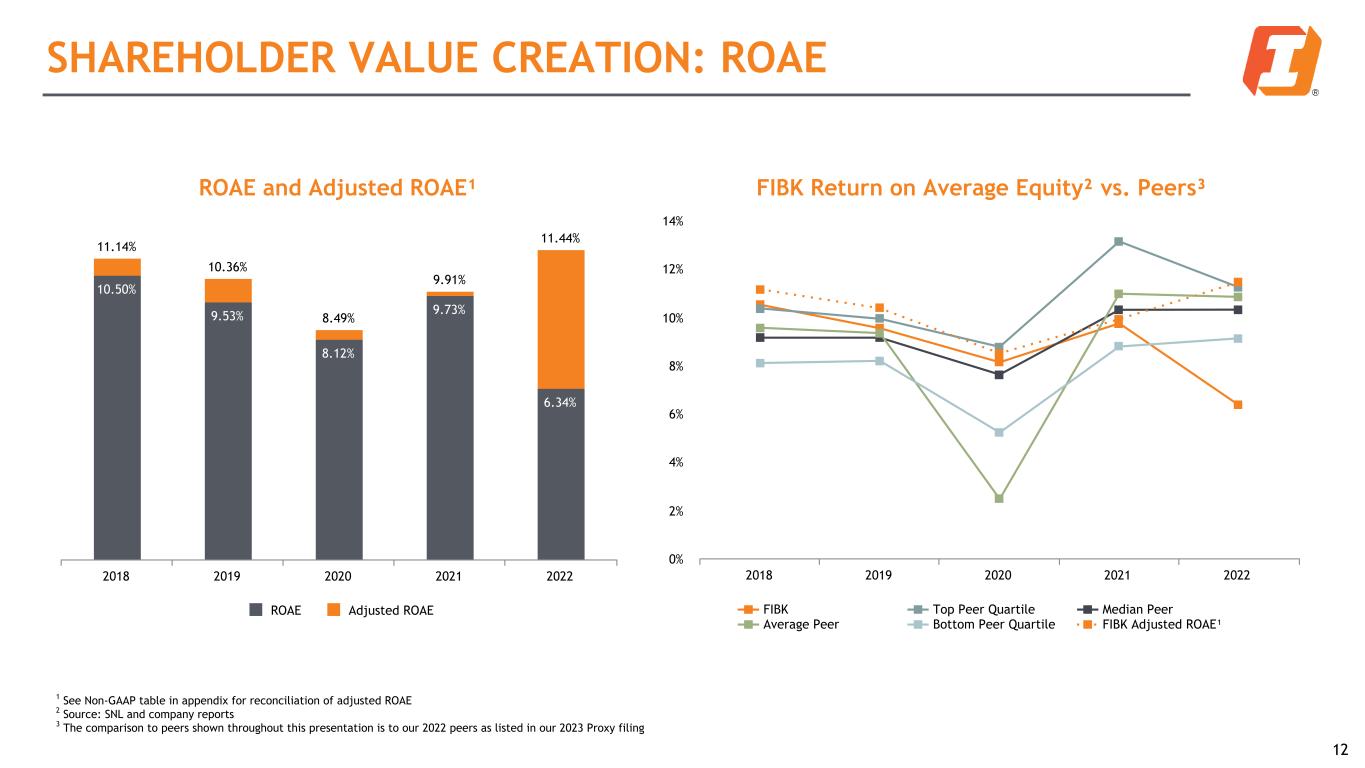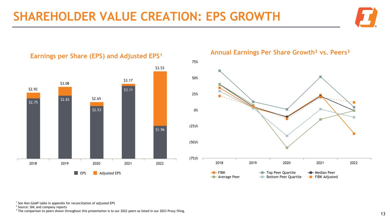 SHAREHOLDER VALUE CREATION: ROAE 12 FIBK Return on Average Equity² vs. Peers³ FIBK Top Peer Quartile Median Peer Average Peer Bottom Peer Quartile FIBK Adjusted ROAE¹ 2018 2019 2020 2021 2022 0% 2% 4% 6% 8% 10% 12% 14% ROAE and Adjusted ROAE¹ 11.14% 10.36% 8.49% 9.91% 11.44% 10.50% 9.53% 8.12% 9.73% 6.34% ROAE Adjusted ROAE 2018 2019 2020 2021 2022 1 See Non-GAAP table in appendix for reconciliation of adjusted ROAE 2 Source: SNL and company reports 3 The comparison to peers shown throughout this presentation is to our 2022 peers as listed in our 2023 Proxy filing