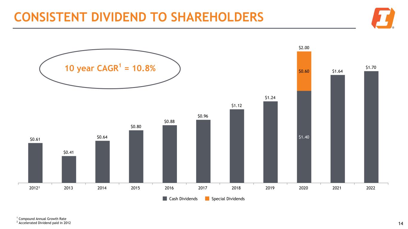 SHAREHOLDER VALUE CREATION: EPS GROWTH 13 Annual Earnings Per Share Growth² vs. Peers³ FIBK Top Peer Quartile Median Peer Average Peer Bottom Peer Quartile FIBK Adjusted 2018 2019 2020 2021 2022 (75)% (50)% (25)% 0% 25% 50% 75% Earnings per Share (EPS) and Adjusted EPS¹ $2.92 $3.08 $2.65 $3.17 $3.53 $2.75 $2.83 $2.53 $3.11 $1.96 EPS Adjusted EPS 2018 2019 2020 2021 2022 1 See Non-GAAP table in appendix for reconciliation of adjusted EPS 2 Source: SNL and company reports 3 The comparison to peers shown throughout this presentation is to our 2022 peers as listed in our 2023 Proxy filing.