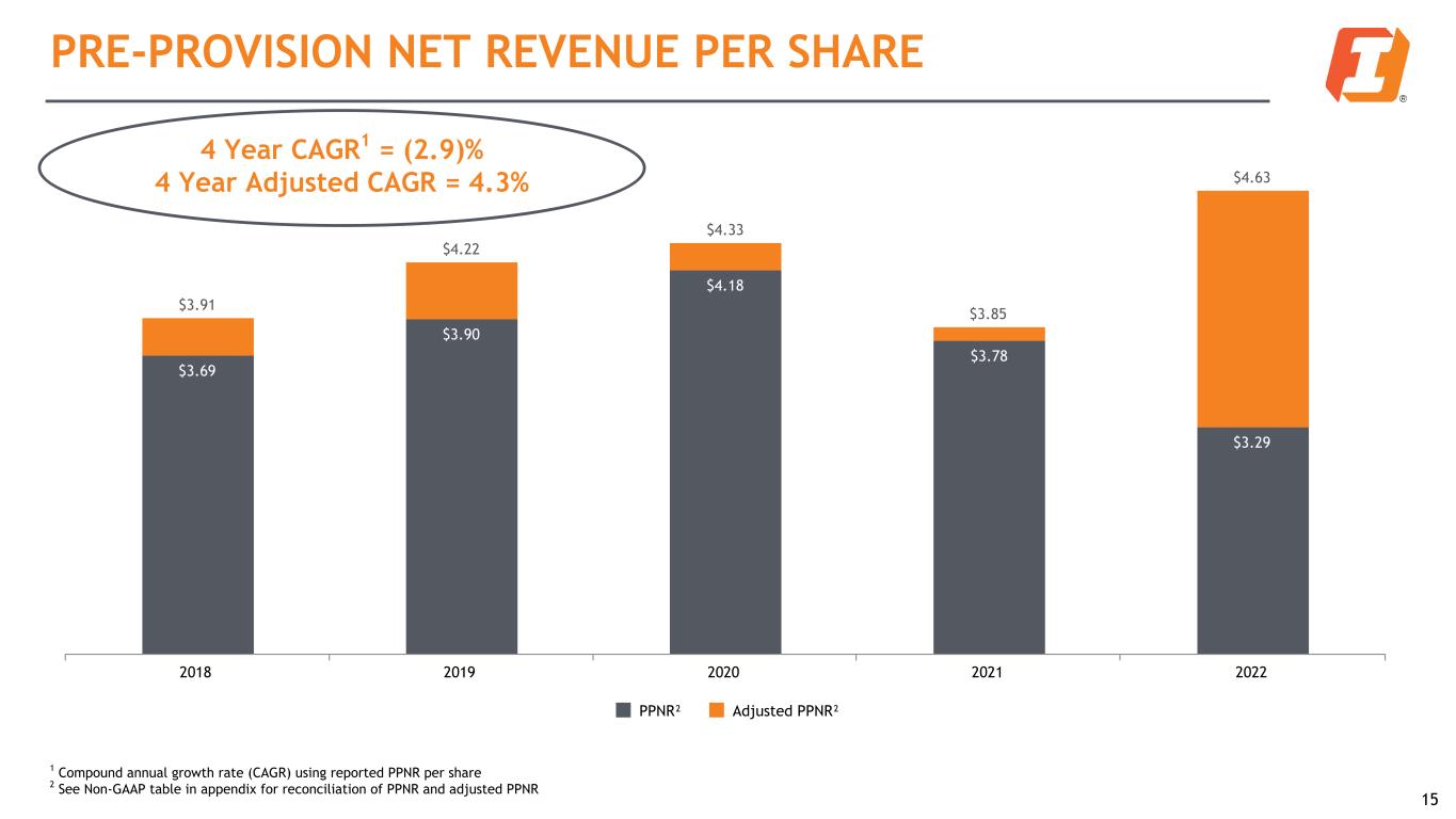2018 2019 2020 2021 2022 (Dollars and shares in millions) Total non-interest expense (A) $ 356.4 $ 388.6 $ 387.5 $ 405.5 $ 766.0 Less: Acquisition-related expense 12.4 20.3 — 11.6 118.9 Less: Litigation accrual — — — 1.0 1.8 Adjusted non-interest expense (B) $ 344.0 $ 368.3 $ 387.5 $ 392.9 $ 645.3 Net interest income (C) $ 432.5 $ 495.0 $ 497.8 $ 489.2 $ 942.6 Add: Total non-interest income (D) 138.8 142.6 155.9 149.5 163.2 Less: Net gain (loss) from investment securities (0.1) 0.1 0.3 1.1 (24.4) Less: MSR recovery (impairment) — (0.4) (9.9) 6.9 3.4 Less: Other income — — — — 3.1 Adjusted revenue (E) $ 571.4 $ 637.9 $ 663.3 $ 630.7 $ 1,123.7 Weighted-average diluted shares outstanding (F) 58.2 63.9 63.7 61.7 103.3 PPNR (Non-GAAP) (C) + (D) - (A) = (G) $ 214.9 $ 249.0 $ 266.2 $ 233.2 $ 339.8 PPNR per share (Non-GAAP) (G) / (F) 3.69 3.90 4.18 3.78 3.29 Adjusted PPNR (Non-GAAP) (E) - (B) = (H) 227.4 269.6 275.8 237.8 478.4 Adjusted PPNR per share (Non-GAAP) (H) / (F) 3.91 4.22 4.33 3.85 4.63 NON-GAAP RECONCILIATION 21* Line items may not sum due to rounding