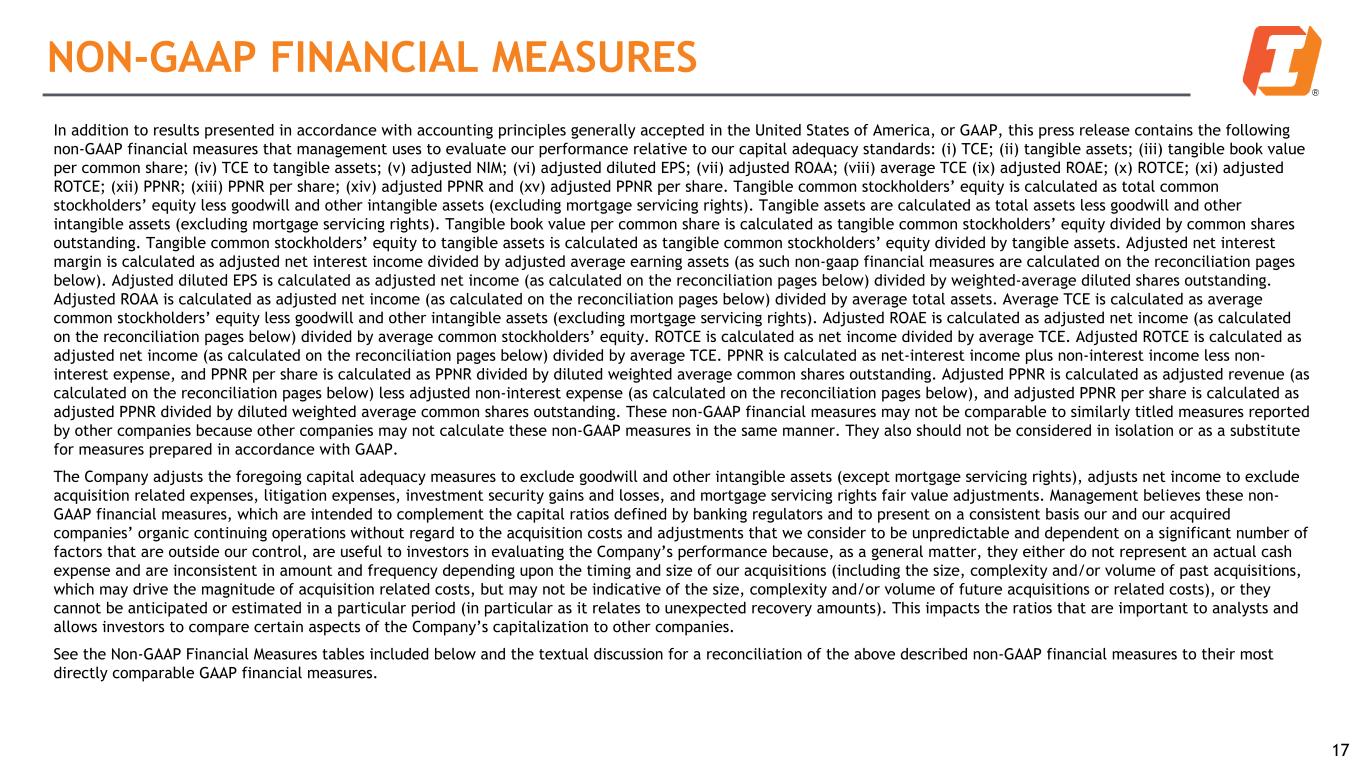 NON-GAAP FINANCIAL MEASURES 17 In addition to results presented in accordance with accounting principles generally accepted in the United States of America, or GAAP, this press release contains the following non-GAAP financial measures that management uses to evaluate our performance relative to our capital adequacy standards: (i) TCE; (ii) tangible assets; (iii) tangible book value per common share; (iv) TCE to tangible assets; (v) adjusted NIM; (vi) adjusted diluted EPS; (vii) adjusted ROAA; (viii) average TCE (ix) adjusted ROAE; (x) ROTCE; (xi) adjusted ROTCE; (xii) PPNR; (xiii) PPNR per share; (xiv) adjusted PPNR and (xv) adjusted PPNR per share. Tangible common stockholders’ equity is calculated as total common stockholders’ equity less goodwill and other intangible assets (excluding mortgage servicing rights). Tangible assets are calculated as total assets less goodwill and other intangible assets (excluding mortgage servicing rights). Tangible book value per common share is calculated as tangible common stockholders’ equity divided by common shares outstanding. Tangible common stockholders’ equity to tangible assets is calculated as tangible common stockholders’ equity divided by tangible assets. Adjusted net interest margin is calculated as adjusted net interest income divided by adjusted average earning assets (as such non-gaap financial measures are calculated on the reconciliation pages below). Adjusted diluted EPS is calculated as adjusted net income (as calculated on the reconciliation pages below) divided by weighted-average diluted shares outstanding. Adjusted ROAA is calculated as adjusted net income (as calculated on the reconciliation pages below) divided by average total assets. Average TCE is calculated as average common stockholders’ equity less goodwill and other intangible assets (excluding mortgage servicing rights). Adjusted ROAE is calculated as adjusted net income (as calculated on the reconciliation pages below) divided by average common stockholders’ equity. ROTCE is calculated as net income divided by average TCE. Adjusted ROTCE is calculated as adjusted net income (as calculated on the reconciliation pages below) divided by average TCE. PPNR is calculated as net-interest income plus non-interest income less non- interest expense, and PPNR per share is calculated as PPNR divided by diluted weighted average common shares outstanding. Adjusted PPNR is calculated as adjusted revenue (as calculated on the reconciliation pages below) less adjusted non-interest expense (as calculated on the reconciliation pages below), and adjusted PPNR per share is calculated as adjusted PPNR divided by diluted weighted average common shares outstanding. These non-GAAP financial measures may not be comparable to similarly titled measures reported by other companies because other companies may not calculate these non-GAAP measures in the same manner. They also should not be considered in isolation or as a substitute for measures prepared in accordance with GAAP. The Company adjusts the foregoing capital adequacy measures to exclude goodwill and other intangible assets (except mortgage servicing rights), adjusts net income to exclude acquisition related expenses, litigation expenses, investment security gains and losses, and mortgage servicing rights fair value adjustments. Management believes these non- GAAP financial measures, which are intended to complement the capital ratios defined by banking regulators and to present on a consistent basis our and our acquired companies’ organic continuing operations without regard to the acquisition costs and adjustments that we consider to be unpredictable and dependent on a significant number of factors that are outside our control, are useful to investors in evaluating the Company’s performance because, as a general matter, they either do not represent an actual cash expense and are inconsistent in amount and frequency depending upon the timing and size of our acquisitions (including the size, complexity and/or volume of past acquisitions, which may drive the magnitude of acquisition related costs, but may not be indicative of the size, complexity and/or volume of future acquisitions or related costs), or they cannot be anticipated or estimated in a particular period (in particular as it relates to unexpected recovery amounts). This impacts the ratios that are important to analysts and allows investors to compare certain aspects of the Company’s capitalization to other companies. See the Non-GAAP Financial Measures tables included below and the textual discussion for a reconciliation of the above described non-GAAP financial measures to their most directly comparable GAAP financial measures.