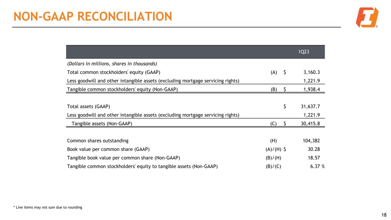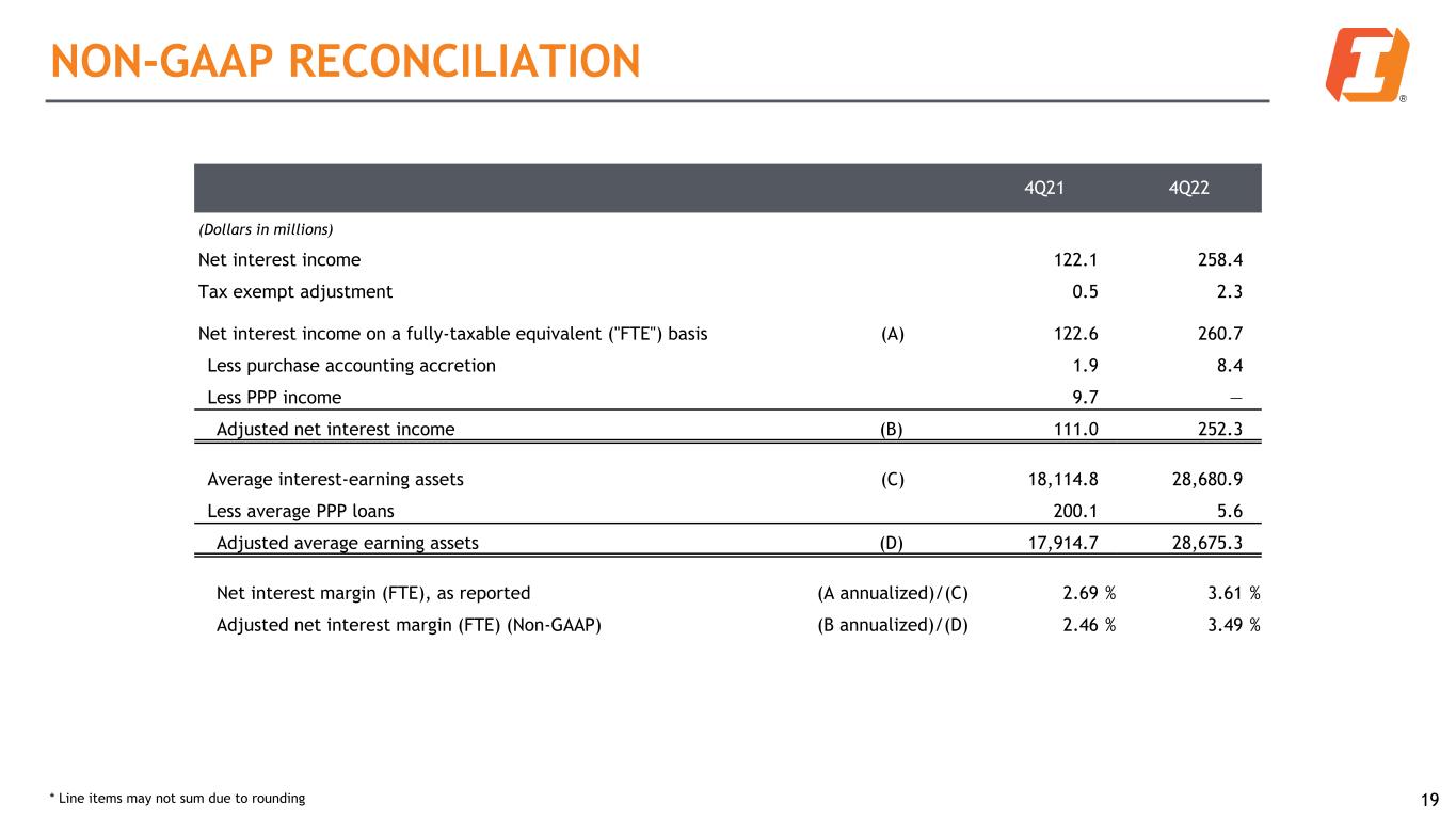 1Q23 (Dollars in millions, shares in thousands) Total common stockholders' equity (GAAP) (A) $ 3,160.3 Less goodwill and other intangible assets (excluding mortgage servicing rights) 1,221.9 Tangible common stockholders' equity (Non-GAAP) (B) $ 1,938.4 Total assets (GAAP) $ 31,637.7 Less goodwill and other intangible assets (excluding mortgage servicing rights) 1,221.9 Tangible assets (Non-GAAP) (C) $ 30,415.8 Common shares outstanding (H) 104,382 Book value per common share (GAAP) (A)/(H) $ 30.28 Tangible book value per common share (Non-GAAP) (B)/(H) 18.57 Tangible common stockholders' equity to tangible assets (Non-GAAP) (B)/(C) 6.37 % NON-GAAP RECONCILIATION 18 * Line items may not sum due to rounding