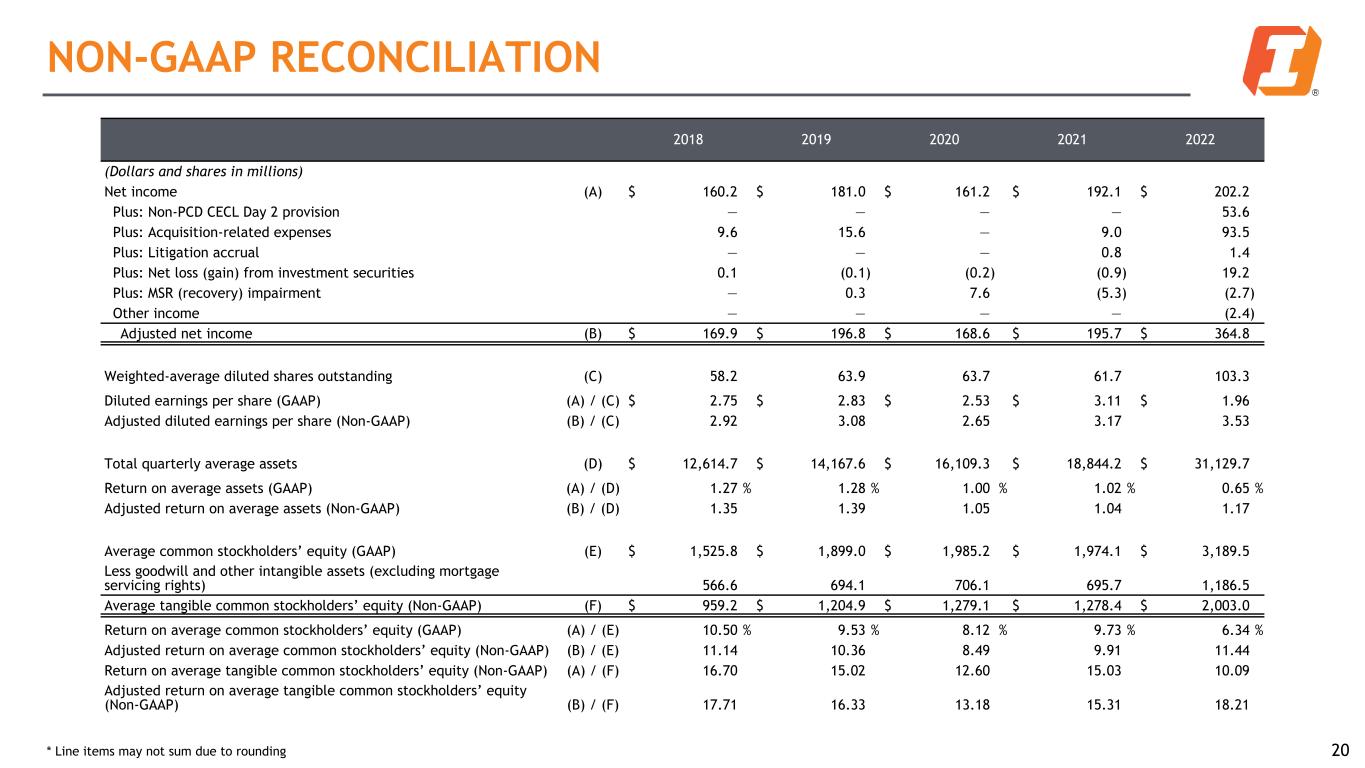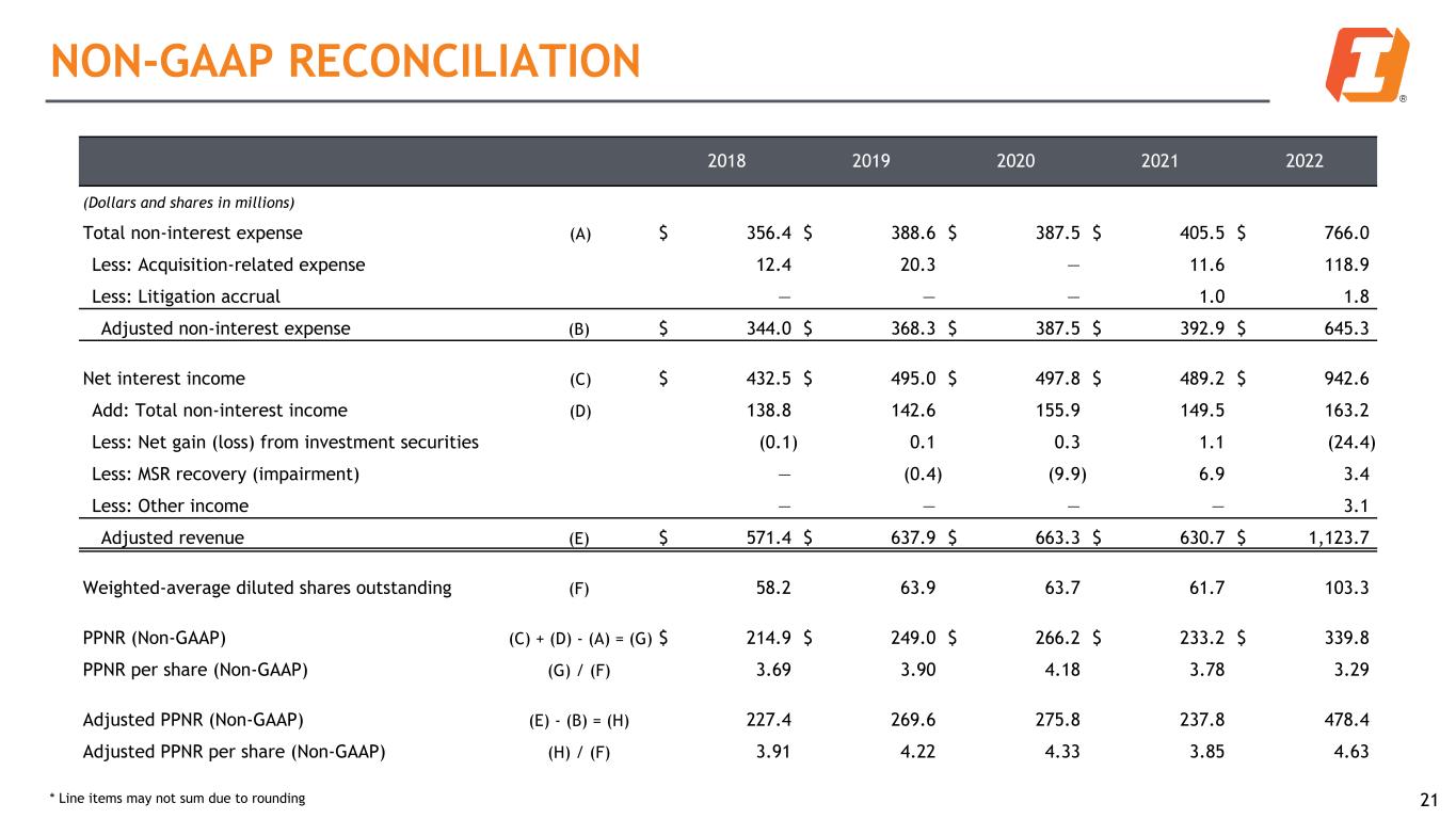 2018 2019 2020 2021 2022 (Dollars and shares in millions) Net income (A) $ 160.2 $ 181.0 $ 161.2 $ 192.1 $ 202.2 Plus: Non-PCD CECL Day 2 provision — — — — 53.6 Plus: Acquisition-related expenses 9.6 15.6 — 9.0 93.5 Plus: Litigation accrual — — — 0.8 1.4 Plus: Net loss (gain) from investment securities 0.1 (0.1) (0.2) (0.9) 19.2 Plus: MSR (recovery) impairment — 0.3 7.6 (5.3) (2.7) Other income — — — — (2.4) Adjusted net income (B) $ 169.9 $ 196.8 $ 168.6 $ 195.7 $ 364.8 Weighted-average diluted shares outstanding (C) 58.2 63.9 63.7 61.7 103.3 Diluted earnings per share (GAAP) (A) / (C) $ 2.75 $ 2.83 $ 2.53 $ 3.11 $ 1.96 Adjusted diluted earnings per share (Non-GAAP) (B) / (C) 2.92 3.08 2.65 3.17 3.53 Total quarterly average assets (D) $ 12,614.7 $ 14,167.6 $ 16,109.3 $ 18,844.2 $ 31,129.7 Return on average assets (GAAP) (A) / (D) 1.27 % 1.28 % 1.00 % 1.02 % 0.65 % Adjusted return on average assets (Non-GAAP) (B) / (D) 1.35 1.39 1.05 1.04 1.17 Average common stockholders’ equity (GAAP) (E) $ 1,525.8 $ 1,899.0 $ 1,985.2 $ 1,974.1 $ 3,189.5 Less goodwill and other intangible assets (excluding mortgage servicing rights) 566.6 694.1 706.1 695.7 1,186.5 Average tangible common stockholders’ equity (Non-GAAP) (F) $ 959.2 $ 1,204.9 $ 1,279.1 $ 1,278.4 $ 2,003.0 Return on average common stockholders’ equity (GAAP) (A) / (E) 10.50 % 9.53 % 8.12 % 9.73 % 6.34 % Adjusted return on average common stockholders’ equity (Non-GAAP) (B) / (E) 11.14 10.36 8.49 9.91 11.44 Return on average tangible common stockholders’ equity (Non-GAAP) (A) / (F) 16.70 15.02 12.60 15.03 10.09 Adjusted return on average tangible common stockholders’ equity (Non-GAAP) (B) / (F) 17.71 16.33 13.18 15.31 18.21 NON-GAAP RECONCILIATION 20* Line items may not sum due to rounding