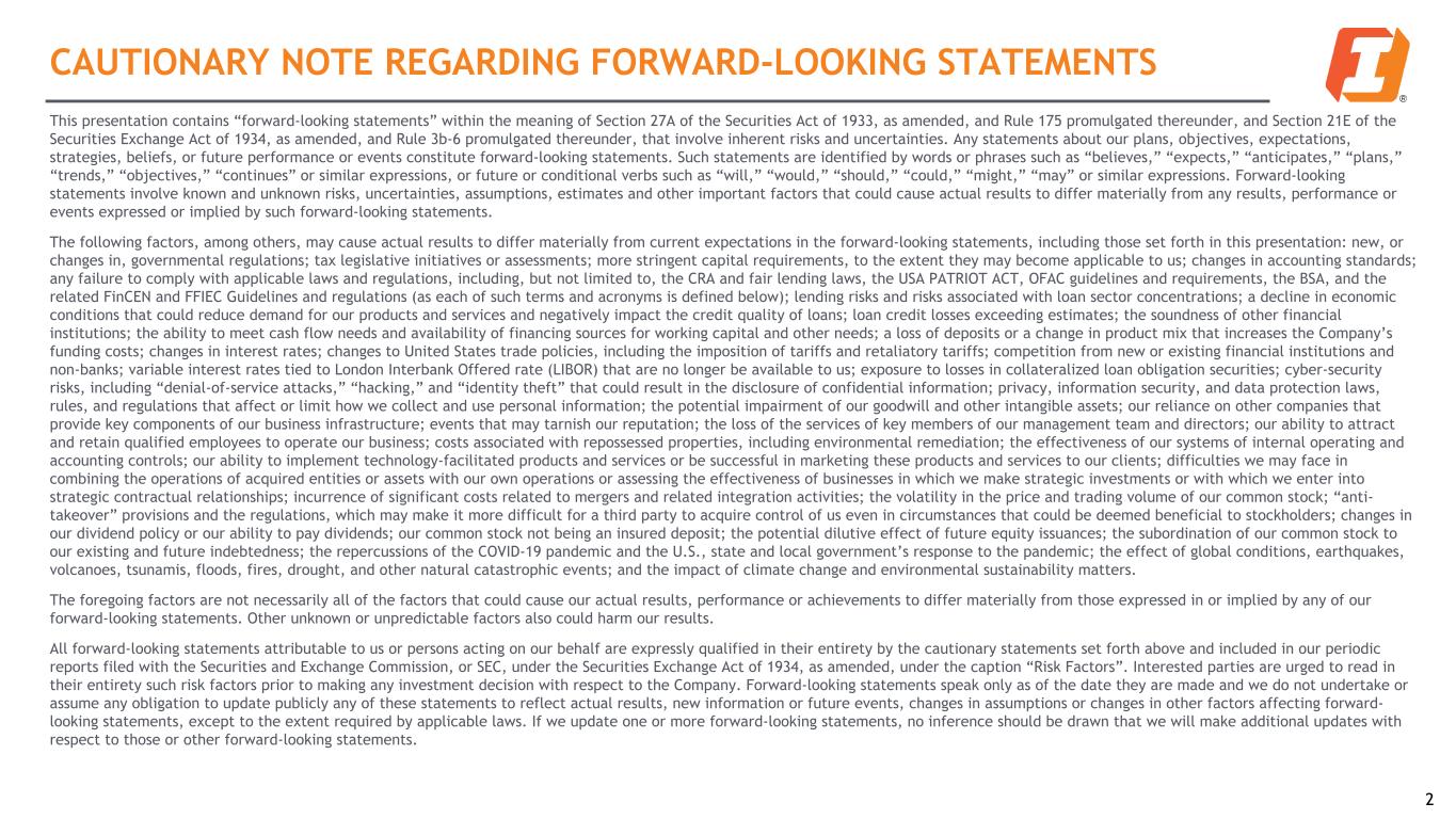 CAUTIONARY NOTE REGARDING FORWARD-LOOKING STATEMENTS This presentation contains “forward-looking statements” within the meaning of Section 27A of the Securities Act of 1933, as amended, and Rule 175 promulgated thereunder, and Section 21E of the Securities Exchange Act of 1934, as amended, and Rule 3b-6 promulgated thereunder, that involve inherent risks and uncertainties. Any statements about our plans, objectives, expectations, strategies, beliefs, or future performance or events constitute forward-looking statements. Such statements are identified by words or phrases such as “believes,” “expects,” “anticipates,” “plans,” “trends,” “objectives,” “continues” or similar expressions, or future or conditional verbs such as “will,” “would,” “should,” “could,” “might,” “may” or similar expressions. Forward-looking statements involve known and unknown risks, uncertainties, assumptions, estimates and other important factors that could cause actual results to differ materially from any results, performance or events expressed or implied by such forward-looking statements. The following factors, among others, may cause actual results to differ materially from current expectations in the forward-looking statements, including those set forth in this presentation: new, or changes in, governmental regulations; tax legislative initiatives or assessments; more stringent capital requirements, to the extent they may become applicable to us; changes in accounting standards; any failure to comply with applicable laws and regulations, including, but not limited to, the CRA and fair lending laws, the USA PATRIOT ACT, OFAC guidelines and requirements, the BSA, and the related FinCEN and FFIEC Guidelines and regulations (as each of such terms and acronyms is defined below); lending risks and risks associated with loan sector concentrations; a decline in economic conditions that could reduce demand for our products and services and negatively impact the credit quality of loans; loan credit losses exceeding estimates; the soundness of other financial institutions; the ability to meet cash flow needs and availability of financing sources for working capital and other needs; a loss of deposits or a change in product mix that increases the Company’s funding costs; changes in interest rates; changes to United States trade policies, including the imposition of tariffs and retaliatory tariffs; competition from new or existing financial institutions and non-banks; variable interest rates tied to London Interbank Offered rate (LIBOR) that are no longer be available to us; exposure to losses in collateralized loan obligation securities; cyber-security risks, including “denial-of-service attacks,” “hacking,” and “identity theft” that could result in the disclosure of confidential information; privacy, information security, and data protection laws, rules, and regulations that affect or limit how we collect and use personal information; the potential impairment of our goodwill and other intangible assets; our reliance on other companies that provide key components of our business infrastructure; events that may tarnish our reputation; the loss of the services of key members of our management team and directors; our ability to attract and retain qualified employees to operate our business; costs associated with repossessed properties, including environmental remediation; the effectiveness of our systems of internal operating and accounting controls; our ability to implement technology-facilitated products and services or be successful in marketing these products and services to our clients; difficulties we may face in combining the operations of acquired entities or assets with our own operations or assessing the effectiveness of businesses in which we make strategic investments or with which we enter into strategic contractual relationships; incurrence of significant costs related to mergers and related integration activities; the volatility in the price and trading volume of our common stock; “anti- takeover” provisions and the regulations, which may make it more difficult for a third party to acquire control of us even in circumstances that could be deemed beneficial to stockholders; changes in our dividend policy or our ability to pay dividends; our common stock not being an insured deposit; the potential dilutive effect of future equity issuances; the subordination of our common stock to our existing and future indebtedness; the repercussions of the COVID-19 pandemic and the U.S., state and local government’s response to the pandemic; the effect of global conditions, earthquakes, volcanoes, tsunamis, floods, fires, drought, and other natural catastrophic events; and the impact of climate change and environmental sustainability matters. The foregoing factors are not necessarily all of the factors that could cause our actual results, performance or achievements to differ materially from those expressed in or implied by any of our forward-looking statements. Other unknown or unpredictable factors also could harm our results. All forward-looking statements attributable to us or persons acting on our behalf are expressly qualified in their entirety by the cautionary statements set forth above and included in our periodic reports filed with the Securities and Exchange Commission, or SEC, under the Securities Exchange Act of 1934, as amended, under the caption “Risk Factors”. Interested parties are urged to read in their entirety such risk factors prior to making any investment decision with respect to the Company. Forward-looking statements speak only as of the date they are made and we do not undertake or assume any obligation to update publicly any of these statements to reflect actual results, new information or future events, changes in assumptions or changes in other factors affecting forward- looking statements, except to the extent requir