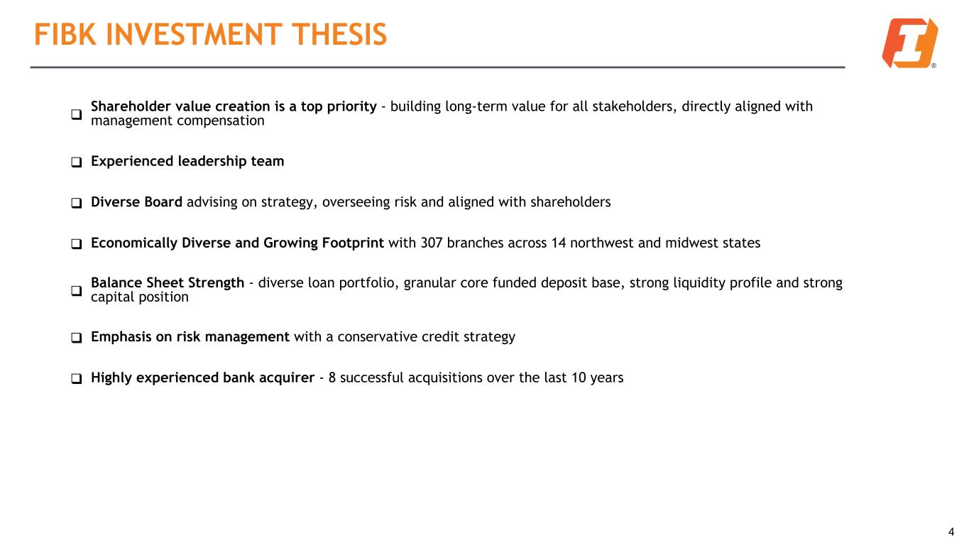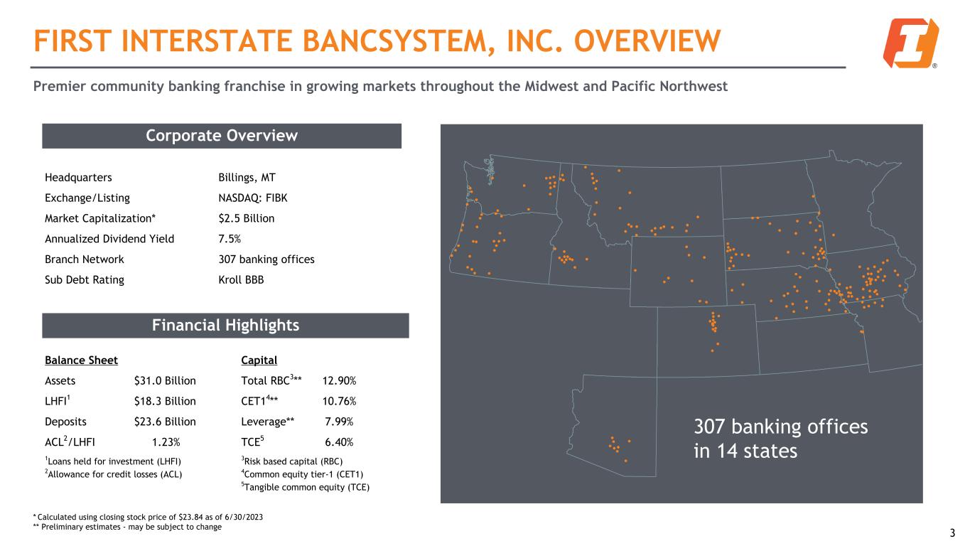 FIRST INTERSTATE BANCSYSTEM, INC. OVERVIEW Premier community banking franchise in growing markets throughout the Midwest and Pacific Northwest Financial Highlights Balance Sheet Capital Assets $31.0 Billion Total RBC3** 12.90% LHFI1 $18.3 Billion CET14** 10.76% Deposits $23.6 Billion Leverage** 7.99% ACL2/LHFI 1.23% TCE5 6.40% 1Loans held for investment (LHFI) 3Risk based capital (RBC) 2Allowance for credit losses (ACL) 4Common equity tier-1 (CET1) 5Tangible common equity (TCE) Corporate Overview Headquarters Billings, MT Exchange/Listing NASDAQ: FIBK Market Capitalization* $2.5 Billion Annualized Dividend Yield 7.5% Branch Network 307 banking offices Sub Debt Rating Kroll BBB 3 307 banking offices in 14 states * Calculated using closing stock price of $23.84 as of 6/30/2023 ** Preliminary estimates - may be subject to change