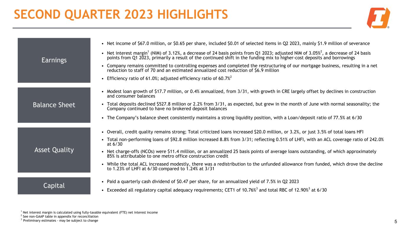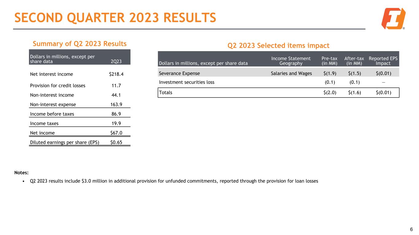SECOND QUARTER 2023 HIGHLIGHTS Earnings • Net income of $67.0 million, or $0.65 per share, included $0.01 of selected items in Q2 2023, mainly $1.9 million of severance • Net interest margin1 (NIM) of 3.12%, a decrease of 24 basis points from Q1 2023; adjusted NIM of 3.05%2, a decrease of 24 basis points from Q1 2023, primarily a result of the continued shift in the funding mix to higher-cost deposits and borrowings • Company remains committed to controlling expenses and completed the restructuring of our mortgage business, resulting in a net reduction to staff of 70 and an estimated annualized cost reduction of $6.9 million • Efficiency ratio of 61.0%; adjusted efficiency ratio of 60.7%2 Balance Sheet • Modest loan growth of $17.7 million, or 0.4% annualized, from 3/31, with growth in CRE largely offset by declines in construction and consumer balances • Total deposits declined $527.8 million or 2.2% from 3/31, as expected, but grew in the month of June with normal seasonality; the Company continued to have no brokered deposit balances • The Company’s balance sheet consistently maintains a strong liquidity position, with a Loan/deposit ratio of 77.5% at 6/30 Asset Quality • Overall, credit quality remains strong; Total criticized loans increased $20.0 million, or 3.2%, or just 3.5% of total loans HFI • Total non-performing loans of $92.8 million increased 8.8% from 3/31; reflecting 0.51% of LHFI, with an ACL coverage ratio of 242.0% at 6/30 • Net charge-offs (NCOs) were $11.4 million, or an annualized 25 basis points of average loans outstanding, of which approximately 85% is attributable to one metro office construction credit • While the total ACL increased modestly, there was a redistribution to the unfunded allowance from funded, which drove the decline to 1.23% of LHFI at 6/30 compared to 1.24% at 3/31 Capital • Paid a quarterly cash dividend of $0.47 per share, for an annualized yield of 7.5% in Q2 2023 • Exceeded all regulatory capital adequacy requirements; CET1 of 10.76%3 and total RBC of 12.90%3 at 6/30 5 1 Net interest margin is calculated using fully-taxable equivalent (FTE) net interest income 2 See non-GAAP table in appendix for reconciliation 3 Preliminary estimates - may be subject to change