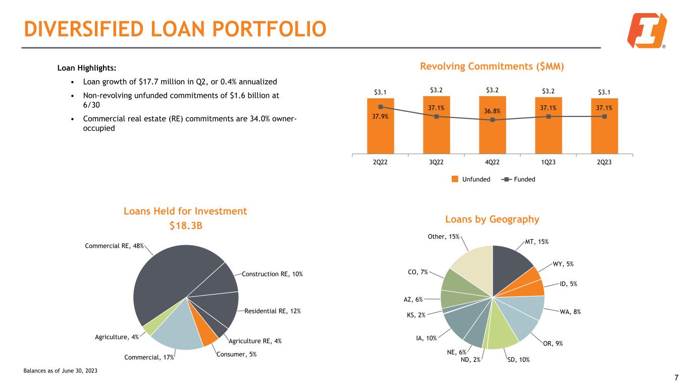 SECOND QUARTER 2023 RESULTS Summary of Q2 2023 Results Dollars in millions, except per share data 2Q23 Net interest income $218.4 Provision for credit losses 11.7 Non-interest income 44.1 Non-interest expense 163.9 Income before taxes 86.9 Income taxes 19.9 Net income $67.0 Diluted earnings per share (EPS) $0.65 Q2 2023 Selected items impact Dollars in millions, except per share data Income Statement Geography Pre-tax (in MM) After-tax (in MM) Reported EPS Impact Severance Expense Salaries and Wages $(1.9) $(1.5) $(0.01) Investment securities loss (0.1) (0.1) — Totals $(2.0) $(1.6) $(0.01) 6 Notes: • Q2 2023 results include $3.0 million in additional provision for unfunded commitments, reported through the provision for loan losses