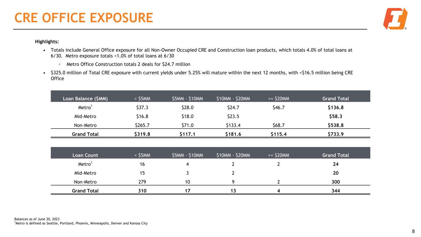 DIVERSIFIED LOAN PORTFOLIO Loans Held for Investment Commercial RE, 48% Construction RE, 10% Residential RE, 12% Agriculture RE, 4% Consumer, 5%Commercial, 17% Agriculture, 4% Loans by Geography MT, 15% WY, 5% ID, 5% WA, 8% OR, 9% SD, 10%ND, 2% NE, 6% IA, 10% KS, 2% AZ, 6% CO, 7% Other, 15% Revolving Commitments ($MM) $3.1 $3.2 $3.2 $3.2 $3.1 37.9% 37.1% 36.8% 37.1% 37.1% Unfunded Funded 2Q22 3Q22 4Q22 1Q23 2Q23 7 Loan Highlights: • Loan growth of $17.7 million in Q2, or 0.4% annualized • Non-revolving unfunded commitments of $1.6 billion at 6/30 • Commercial real estate (RE) commitments are 34.0% owner- occupied $18.3B Balances as of June 30, 2023