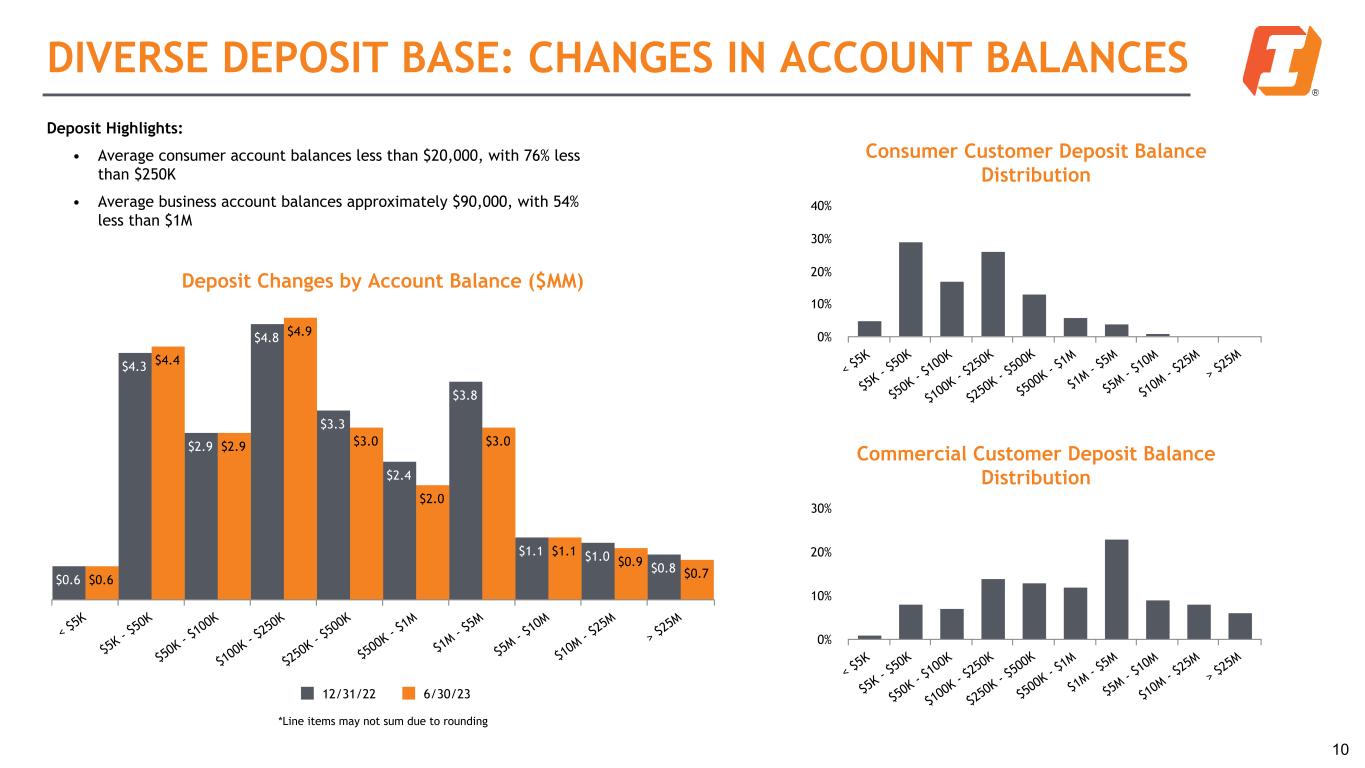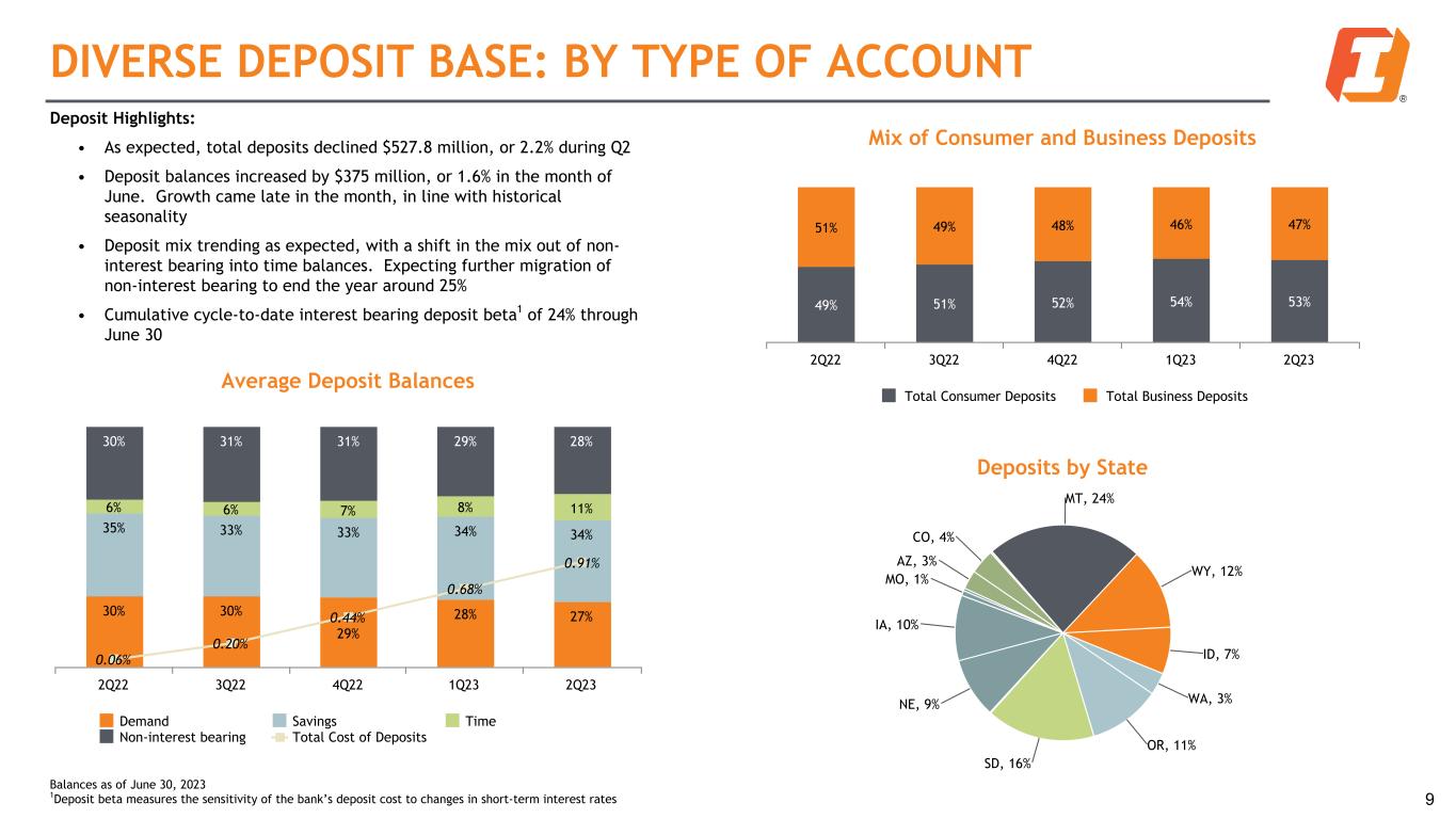 Deposits by State MT, 24% WY, 12% ID, 7% WA, 3% OR, 11% SD, 16% NE, 9% IA, 10% MO, 1% AZ, 3% CO, 4% Mix of Consumer and Business Deposits 49% 51% 52% 54% 53% 51% 49% 48% 46% 47% Total Consumer Deposits Total Business Deposits 2Q22 3Q22 4Q22 1Q23 2Q23 9 Deposit Highlights: • As expected, total deposits declined $527.8 million, or 2.2% during Q2 • Deposit balances increased by $375 million, or 1.6% in the month of June. Growth came late in the month, in line with historical seasonality • Deposit mix trending as expected, with a shift in the mix out of non- interest bearing into time balances. Expecting further migration of non-interest bearing to end the year around 25% • Cumulative cycle-to-date interest bearing deposit beta1 of 24% through June 30 Average Deposit Balances 30% 30% 29% 28% 27% 35% 33% 33% 34% 34% 6% 6% 7% 8% 11% 30% 31% 31% 29% 28% 0.06% 0.20% 0.44% 0.68% 0.91% Demand Savings Time Non-interest bearing Total Cost of Deposits 2Q22 3Q22 4Q22 1Q23 2Q23 DIVERSE DEPOSIT BASE: BY TYPE OF ACCOUNT Balances as of June 30, 2023 1Deposit beta measures the sensitivity of the bank’s deposit cost to changes in short-term interest rates