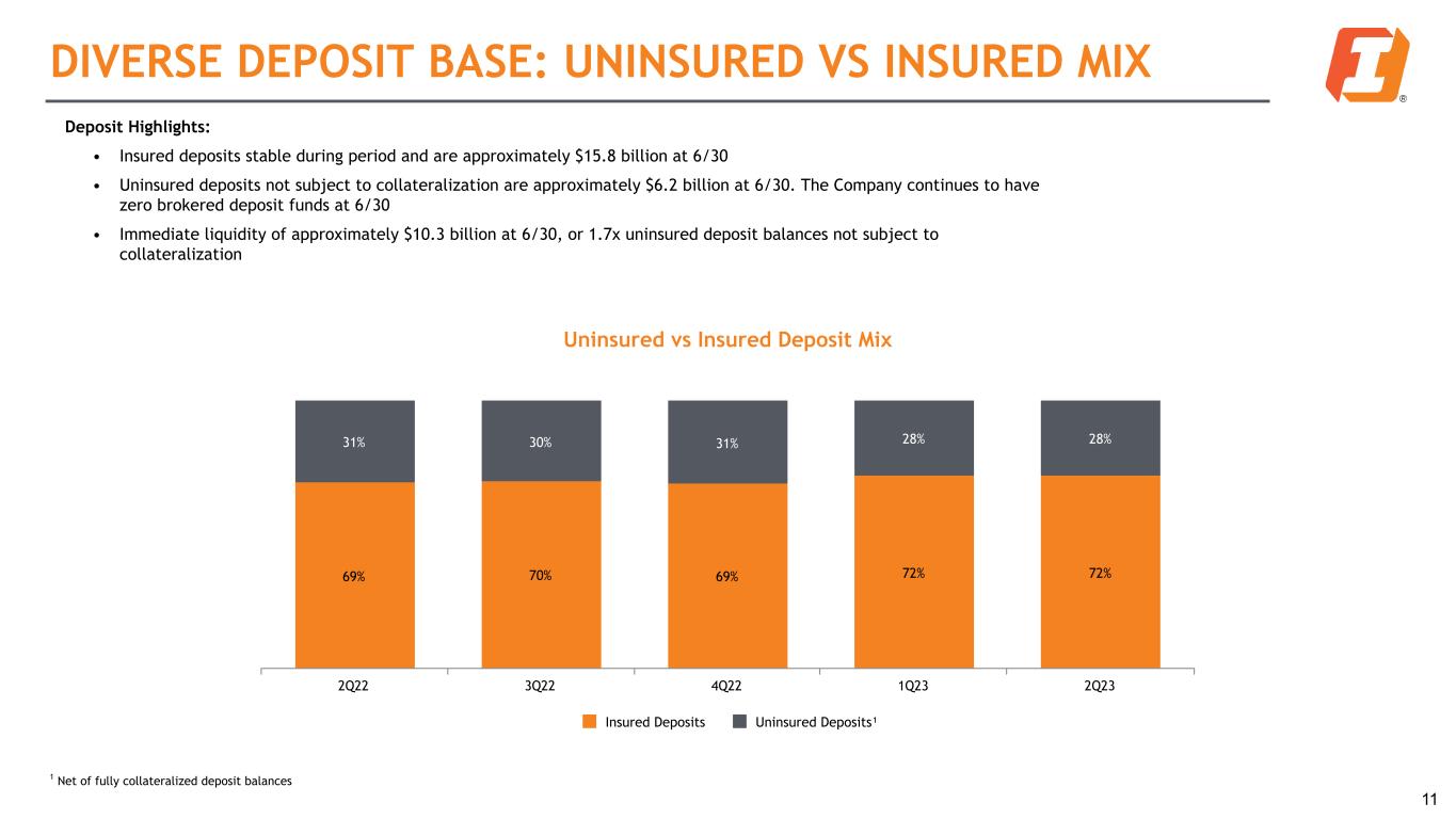 DIVERSE DEPOSIT BASE: CHANGES IN ACCOUNT BALANCES Deposit Changes by Account Balance ($MM) $0.6 $4.3 $2.9 $4.8 $3.3 $2.4 $3.8 $1.1 $1.0 $0.8 $0.6 $4.4 $2.9 $4.9 $3.0 $2.0 $3.0 $1.1 $0.9 $0.7 12/31/22 6/30/23 < $ 5K $5 K - $ 50 K $5 0K - $ 10 0K $1 00 K - $ 25 0K $2 50 K - $ 50 0K $5 00 K - $ 1M $1 M - $ 5M $5 M - $ 10 M $1 0M - $ 25 M > $ 25 M 10 Commercial Customer Deposit Balance Distribution < $ 5K $5 K - $ 50 K $5 0K - $ 10 0K $1 00 K - $ 25 0K $2 50 K - $ 50 0K $5 00 K - $ 1M $1 M - $ 5M $5 M - $ 10 M $1 0M - $ 25 M > $ 25 M 0% 10% 20% 30% Consumer Customer Deposit Balance Distribution < $ 5K $5 K - $ 50 K $5 0K - $ 10 0K $1 00 K - $ 25 0K $2 50 K - $ 50 0K $5 00 K - $ 1M $1 M - $ 5M $5 M - $ 10 M $1 0M - $ 25 M > $ 25 M 0% 10% 20% 30% 40% Deposit Highlights: • Average consumer account balances less than $20,000, with 76% less than $250K • Average business account balances approximately $90,000, with 54% less than $1M *Line items may not sum due to rounding
