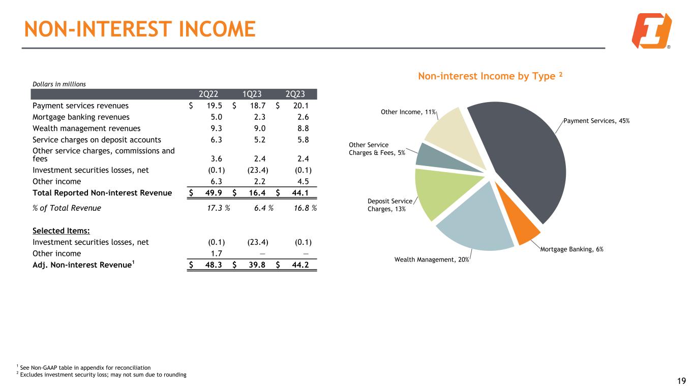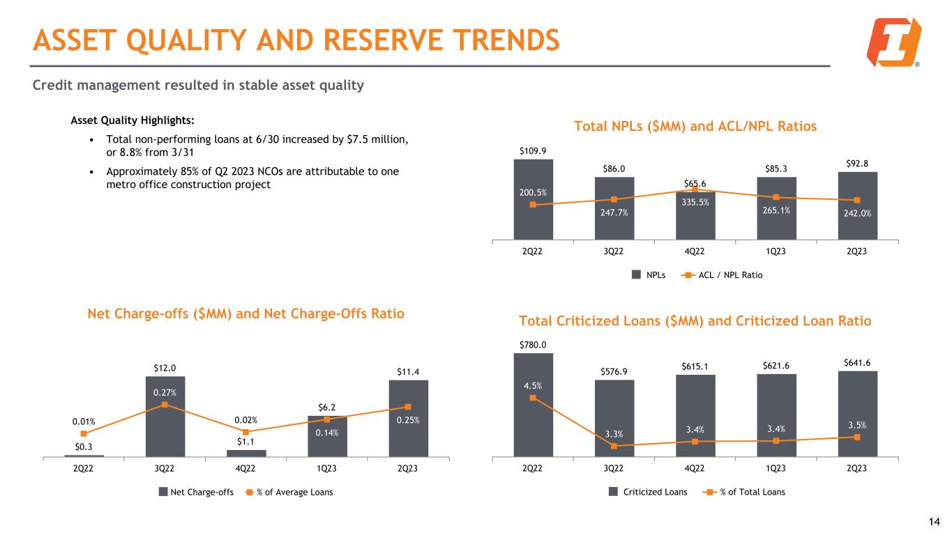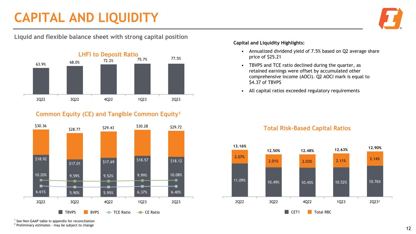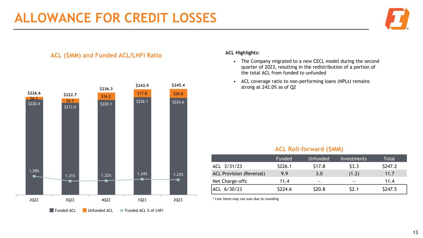 Total Risk-Based Capital Ratios 13.16% 12.50% 12.48% 12.63% 12.90% 11.09% 10.49% 10.45% 10.52% 10.76% 2.07% 2.01% 2.03% 2.11% 2.14% CET1 Total RBC 2Q22 3Q22 4Q22 1Q23 2Q23² CAPITAL AND LIQUIDITY Liquid and flexible balance sheet with strong capital position Common Equity (CE) and Tangible Common Equity¹ $30.36 $28.77 $29.43 $30.28 $29.72 $18.92 $17.01 $17.69 $18.57 $18.12 6.61% 5.90% 5.95% 6.37% 6.40% 10.20% 9.59% 9.52% 9.99% 10.08% TBVPS BVPS TCE Ratio CE Ratio 2Q22 3Q22 4Q22 1Q23 2Q23 12 LHFI to Deposit Ratio 63.9% 68.0% 72.2% 75.7% 77.5% 2Q22 3Q22 4Q22 1Q23 2Q23 Capital and Liquidity Highlights: • Annualized dividend yield of 7.5% based on Q2 average share price of $25.21 • TBVPS and TCE ratio declined during the quarter, as retained earnings were offset by accumulated other comprehensive income (AOCI). Q2 AOCI mark is equal to $4.37 of TBVPS • All capital ratios exceeded regulatory requirements 1 See Non-GAAP table in appendix for reconciliation 2 Preliminary estimates - may be subject to change