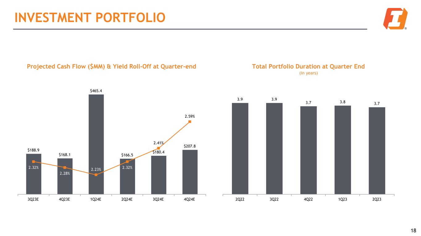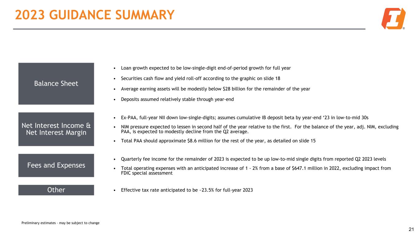 Balance Sheet • Loan growth expected to be low-single-digit end-of-period growth for full year • Securities cash flow and yield roll-off according to the graphic on slide 18 • Average earning assets will be modestly below $28 billion for the remainder of the year • Deposits assumed relatively stable through year-end Net Interest Income & Net Interest Margin • Ex-PAA, full-year NII down low-single-digits; assumes cumulative IB deposit beta by year-end ‘23 in low-to-mid 30s • NIM pressure expected to lessen in second half of the year relative to the first. For the balance of the year, adj. NIM, excluding PAA, is expected to modestly decline from the Q2 average. • Total PAA should approximate $8.6 million for the rest of the year, as detailed on slide 15 Fees and Expenses • Quarterly fee income for the remainder of 2023 is expected to be up low-to-mid single digits from reported Q2 2023 levels • Total operating expenses with an anticipated increase of 1 - 2% from a base of $647.1 million in 2022, excluding impact from FDIC special assessment Other • Effective tax rate anticipated to be ~23.5% for full-year 2023 2023 GUIDANCE SUMMARY 21 Preliminary estimates - may be subject to change
