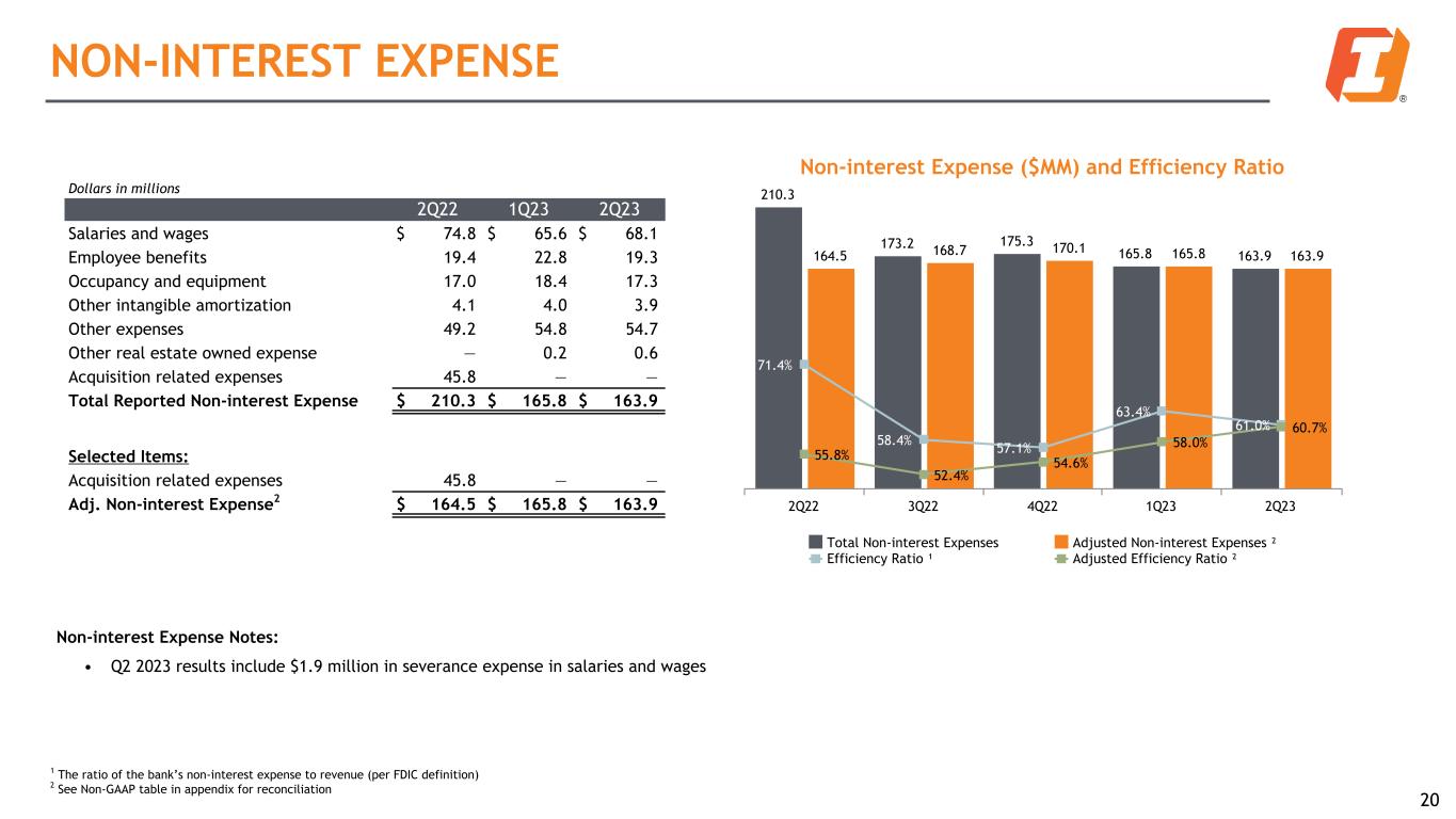 19 Non-interest Income by Type ² Payment Services, 45% Mortgage Banking, 6% Wealth Management, 20% Deposit Service Charges, 13% Other Service Charges & Fees, 5% Other Income, 11% Dollars in millions 2Q22 1Q23 2Q23 Payment services revenues $ 19.5 $ 18.7 $ 20.1 Mortgage banking revenues 5.0 2.3 2.6 Wealth management revenues 9.3 9.0 8.8 Service charges on deposit accounts 6.3 5.2 5.8 Other service charges, commissions and fees 3.6 2.4 2.4 Investment securities losses, net (0.1) (23.4) (0.1) Other income 6.3 2.2 4.5 Total Reported Non-interest Revenue $ 49.9 $ 16.4 $ 44.1 % of Total Revenue 17.3 % 6.4 % 16.8 % Selected Items: Investment securities losses, net (0.1) (23.4) (0.1) Other income 1.7 — — Adj. Non-interest Revenue1 $ 48.3 $ 39.8 $ 44.2 NON-INTEREST INCOME 1 See Non-GAAP table in appendix for reconciliation 2 Excludes investment security loss; may not sum due to rounding