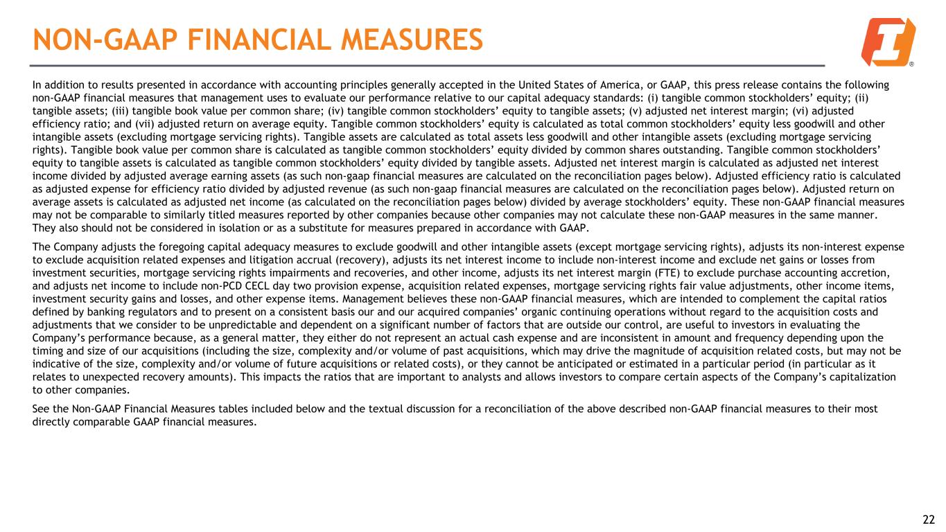 NON-GAAP FINANCIAL MEASURES 22 In addition to results presented in accordance with accounting principles generally accepted in the United States of America, or GAAP, this press release contains the following non-GAAP financial measures that management uses to evaluate our performance relative to our capital adequacy standards: (i) tangible common stockholders’ equity; (ii) tangible assets; (iii) tangible book value per common share; (iv) tangible common stockholders’ equity to tangible assets; (v) adjusted net interest margin; (vi) adjusted efficiency ratio; and (vii) adjusted return on average equity. Tangible common stockholders’ equity is calculated as total common stockholders’ equity less goodwill and other intangible assets (excluding mortgage servicing rights). Tangible assets are calculated as total assets less goodwill and other intangible assets (excluding mortgage servicing rights). Tangible book value per common share is calculated as tangible common stockholders’ equity divided by common shares outstanding. Tangible common stockholders’ equity to tangible assets is calculated as tangible common stockholders’ equity divided by tangible assets. Adjusted net interest margin is calculated as adjusted net interest income divided by adjusted average earning assets (as such non-gaap financial measures are calculated on the reconciliation pages below). Adjusted efficiency ratio is calculated as adjusted expense for efficiency ratio divided by adjusted revenue (as such non-gaap financial measures are calculated on the reconciliation pages below). Adjusted return on average assets is calculated as adjusted net income (as calculated on the reconciliation pages below) divided by average stockholders’ equity. These non-GAAP financial measures may not be comparable to similarly titled measures reported by other companies because other companies may not calculate these non-GAAP measures in the same manner. They also should not be considered in isolation or as a substitute for measures prepared in accordance with GAAP. The Company adjusts the foregoing capital adequacy measures to exclude goodwill and other intangible assets (except mortgage servicing rights), adjusts its non-interest expense to exclude acquisition related expenses and litigation accrual (recovery), adjusts its net interest income to include non-interest income and exclude net gains or losses from investment securities, mortgage servicing rights impairments and recoveries, and other income, adjusts its net interest margin (FTE) to exclude purchase accounting accretion, and adjusts net income to include non-PCD CECL day two provision expense, acquisition related expenses, mortgage servicing rights fair value adjustments, other income items, investment security gains and losses, and other expense items. Management believes these non-GAAP financial measures, which are intended to complement the capital ratios defined by banking regulators and to present on a consistent basis our and our acquired companies’ organic continuing operations without regard to the acquisition costs and adjustments that we consider to be unpredictable and dependent on a significant number of factors that are outside our control, are useful to investors in evaluating the Company’s performance because, as a general matter, they either do not represent an actual cash expense and are inconsistent in amount and frequency depending upon the timing and size of our acquisitions (including the size, complexity and/or volume of past acquisitions, which may drive the magnitude of acquisition related costs, but may not be indicative of the size, complexity and/or volume of future acquisitions or related costs), or they cannot be anticipated or estimated in a particular period (in particular as it relates to unexpected recovery amounts). This impacts the ratios that are important to analysts and allows investors to compare certain aspects of the Company’s capitalization to other companies. See the Non-GAAP Financial Measures tables included below and the textual discussion for a reconciliation of the above described non-GAAP financial measures to their most directly comparable GAAP financial measures.