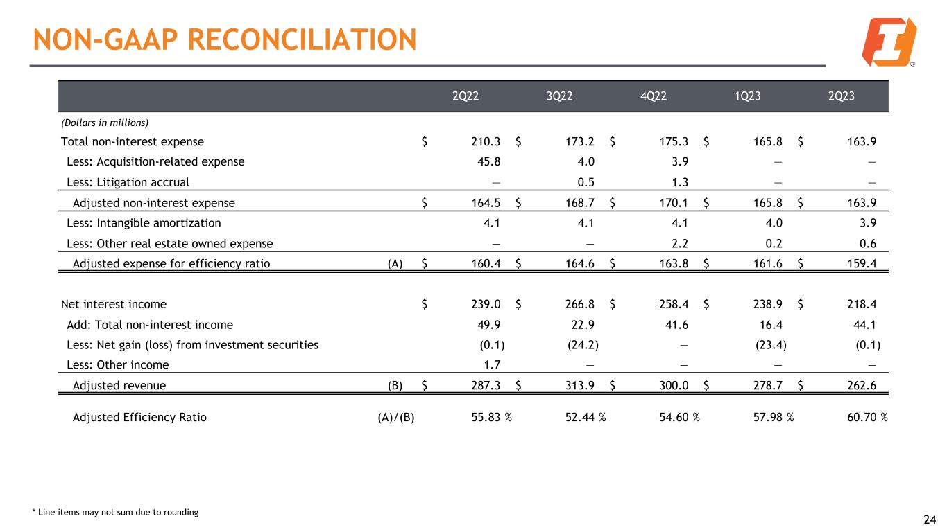 2Q22 3Q22 4Q22 1Q23 2Q23 (Dollars in millions) Total common stockholders' equity (GAAP) (A) $ 3,271.9 $ 3,005.5 $ 3,073.8 $ 3,160.3 $ 3,121.2 Less goodwill and other intangible assets (excluding mortgage servicing rights) 1,232.9 1,229.0 1,225.9 1,221.9 1,218.0 Tangible common stockholders' equity (Non-GAAP) (B) $ 2,039.0 $ 1,776.5 $ 1,847.9 $ 1,938.4 $ 1,903.2 Total assets (GAAP) $ 32,061.8 $ 31,344.7 $ 32,287.8 $ 31,637.7 $ 30,976.3 Less goodwill and other intangible assets (excluding mortgage servicing rights) 1,232.9 1,229.0 1,225.9 1,221.9 1,218.0 Tangible assets (Non-GAAP) (C) $ 30,828.9 $ 30,115.7 $ 31,061.9 $ 30,415.8 $ 29,758.3 Common shares outstanding (L) 107,758 104,451 104,442 104,382 105,021 Book value per common share (GAAP) (A) / (L) $ 30.36 $ 28.77 $ 29.43 $ 30.28 $ 29.72 Tangible book value per common share (Non-GAAP) (B) / (L) 18.92 17.01 17.69 18.57 18.12 Tangible common stockholders' equity to tangible assets (Non-GAAP) (B) / (C) 6.61 % 5.90 % 5.95 % 6.37 % 6.40 % NON-GAAP RECONCILIATION 23 * Line items may not sum due to rounding
