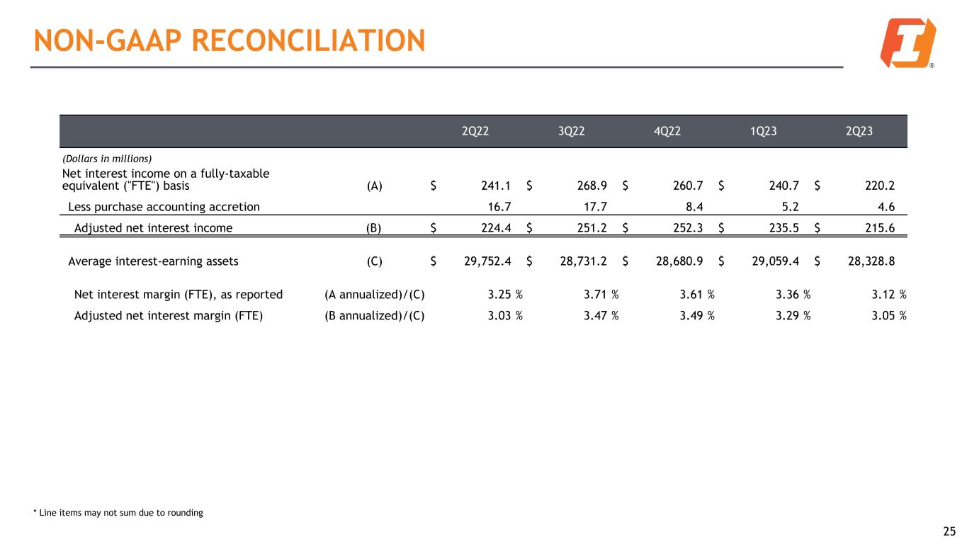 2Q22 3Q22 4Q22 1Q23 2Q23 (Dollars in millions) Total non-interest expense $ 210.3 $ 173.2 $ 175.3 $ 165.8 $ 163.9 Less: Acquisition-related expense 45.8 4.0 3.9 — — Less: Litigation accrual — 0.5 1.3 — — Adjusted non-interest expense $ 164.5 $ 168.7 $ 170.1 $ 165.8 $ 163.9 Less: Intangible amortization 4.1 4.1 4.1 4.0 3.9 Less: Other real estate owned expense — — 2.2 0.2 0.6 Adjusted expense for efficiency ratio (A) $ 160.4 $ 164.6 $ 163.8 $ 161.6 $ 159.4 Net interest income $ 239.0 $ 266.8 $ 258.4 $ 238.9 $ 218.4 Add: Total non-interest income 49.9 22.9 41.6 16.4 44.1 Less: Net gain (loss) from investment securities (0.1) (24.2) — (23.4) (0.1) Less: Other income 1.7 — — — — Adjusted revenue (B) $ 287.3 $ 313.9 $ 300.0 $ 278.7 $ 262.6 Adjusted Efficiency Ratio (A)/(B) 55.83 % 52.44 % 54.60 % 57.98 % 60.70 % NON-GAAP RECONCILIATION 24 * Line items may not sum due to rounding