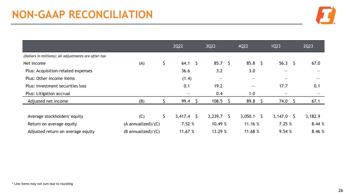 2Q22 3Q22 4Q22 1Q23 2Q23 (Dollars in millions) Net interest income on a fully-taxable equivalent ("FTE") basis (A) $ 241.1 $ 268.9 $ 260.7 $ 240.7 $ 220.2 Less purchase accounting accretion 16.7 17.7 8.4 5.2 4.6 Adjusted net interest income (B) $ 224.4 $ 251.2 $ 252.3 $ 235.5 $ 215.6 Average interest-earning assets (C) $ 29,752.4 $ 28,731.2 $ 28,680.9 $ 29,059.4 $ 28,328.8 Net interest margin (FTE), as reported (A annualized)/(C) 3.25 % 3.71 % 3.61 % 3.36 % 3.12 % Adjusted net interest margin (FTE) (B annualized)/(C) 3.03 % 3.47 % 3.49 % 3.29 % 3.05 % NON-GAAP RECONCILIATION 25 * Line items may not sum due to rounding
