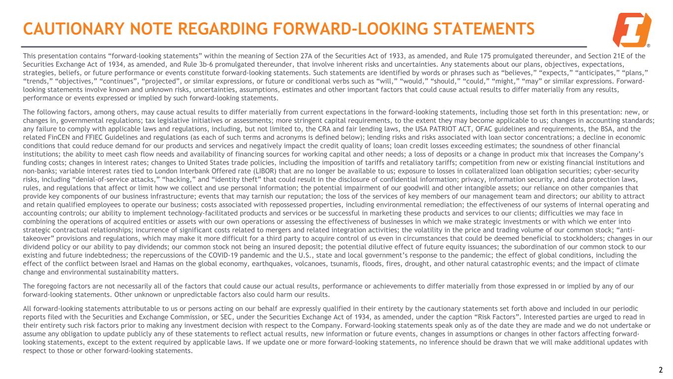 CAUTIONARY NOTE REGARDING FORWARD-LOOKING STATEMENTS This presentation contains “forward-looking statements” within the meaning of Section 27A of the Securities Act of 1933, as amended, and Rule 175 promulgated thereunder, and Section 21E of the Securities Exchange Act of 1934, as amended, and Rule 3b-6 promulgated thereunder, that involve inherent risks and uncertainties. Any statements about our plans, objectives, expectations, strategies, beliefs, or future performance or events constitute forward-looking statements. Such statements are identified by words or phrases such as “believes,” “expects,” “anticipates,” “plans,” “trends,” “objectives,” “continues”, “projected”, or similar expressions, or future or conditional verbs such as “will,” “would,” “should,” “could,” “might,” “may” or similar expressions. Forward- looking statements involve known and unknown risks, uncertainties, assumptions, estimates and other important factors that could cause actual results to differ materially from any results, performance or events expressed or implied by such forward-looking statements. The following factors, among others, may cause actual results to differ materially from current expectations in the forward-looking statements, including those set forth in this presentation: new, or changes in, governmental regulations; tax legislative initiatives or assessments; more stringent capital requirements, to the extent they may become applicable to us; changes in accounting standards; any failure to comply with applicable laws and regulations, including, but not limited to, the CRA and fair lending laws, the USA PATRIOT ACT, OFAC guidelines and requirements, the BSA, and the related FinCEN and FFIEC Guidelines and regulations (as each of such terms and acronyms is defined below); lending risks and risks associated with loan sector concentrations; a decline in economic conditions that could reduce demand for our products and services and negatively impact the credit quality of loans; loan credit losses exceeding estimates; the soundness of other financial institutions; the ability to meet cash flow needs and availability of financing sources for working capital and other needs; a loss of deposits or a change in product mix that increases the Company’s funding costs; changes in interest rates; changes to United States trade policies, including the imposition of tariffs and retaliatory tariffs; competition from new or existing financial institutions and non-banks; variable interest rates tied to London Interbank Offered rate (LIBOR) that are no longer be available to us; exposure to losses in collateralized loan obligation securities; cyber-security risks, including “denial-of-service attacks,” “hacking,” and “identity theft” that could result in the disclosure of confidential information; privacy, information security, and data protection laws, rules, and regulations that affect or limit how we collect and use personal information; the potential impairment of our goodwill and other intangible assets; our reliance on other companies that provide key components of our business infrastructure; events that may tarnish our reputation; the loss of the services of key members of our management team and directors; our ability to attract and retain qualified employees to operate our business; costs associated with repossessed properties, including environmental remediation; the effectiveness of our systems of internal operating and accounting controls; our ability to implement technology-facilitated products and services or be successful in marketing these products and services to our clients; difficulties we may face in combining the operations of acquired entities or assets with our own operations or assessing the effectiveness of businesses in which we make strategic investments or with which we enter into strategic contractual relationships; incurrence of significant costs related to mergers and related integration activities; the volatility in the price and trading volume of our common stock; “anti- takeover” provisions and regulations, which may make it more difficult for a third party to acquire control of us even in circumstances that could be deemed beneficial to stockholders; changes in our dividend policy or our ability to pay dividends; our common stock not being an insured deposit; the potential dilutive effect of future equity issuances; the subordination of our common stock to our existing and future indebtedness; the repercussions of the COVID-19 pandemic and the U.S., state and local government’s response to the pandemic; the effect of global conditions, including the effect of the conflict between Israel and Hamas on the global economy, earthquakes, volcanoes, tsunamis, floods, fires, drought, and other natural catastrophic events; and the impact of climate change and environmental sustainability matters. The foregoing factors are not necessarily all of the factors that could cause our actual results, performance or achievements to differ materially from those expressed in or implied by any of our forward-looking statements. Other unknown or unpredictable factors also could harm our results. All forward-looking statements attributable to us or persons acting on our behalf are expressly qualified in their entirety by the cautionary statements set forth above and included in our periodic reports filed with the Securities and Exchange Commission, or SEC, under the Securities Exchange Act of 1934, as amended, under the caption “Risk Factors”. Interested parties are urged to read in their entirety such risk factors prior to making any investment decision with respect to the Company. Forward-looking statements speak only as of the date they are made and we do not undertake or assume any obligation to update publicly any of these statements to reflect actual results, new information or future events, changes in assump