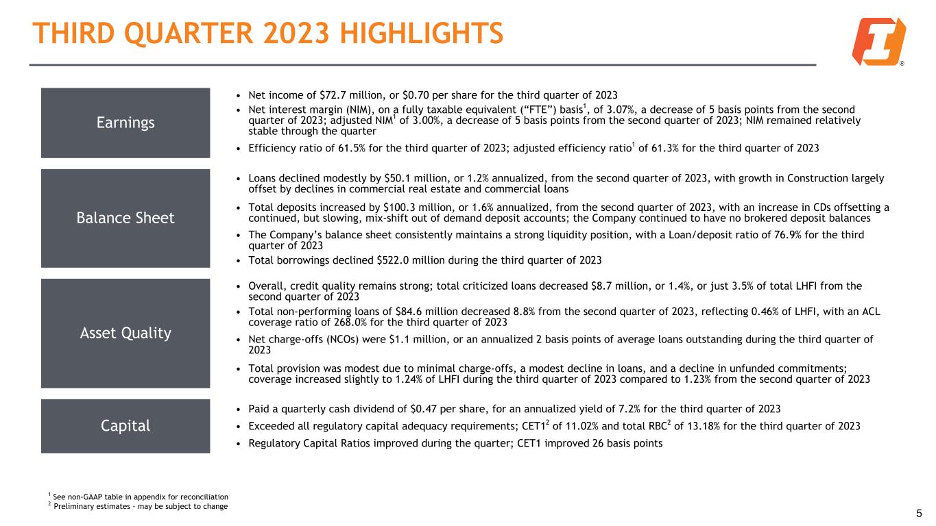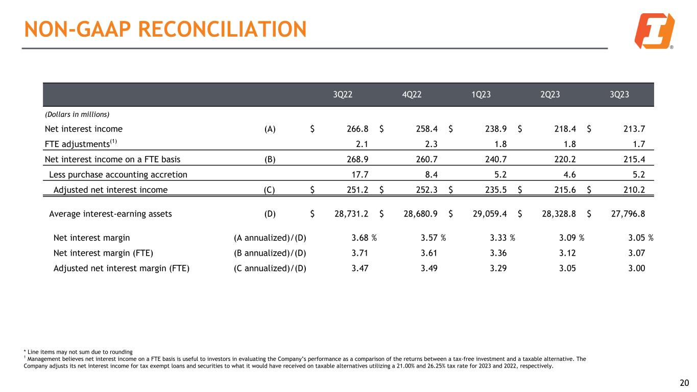 3Q22 4Q22 1Q23 2Q23 3Q23 (Dollars in millions) Net interest income (A) $ 266.8 $ 258.4 $ 238.9 $ 218.4 $ 213.7 FTE adjustments(1) 2.1 2.3 1.8 1.8 1.7 Net interest income on a FTE basis (B) 268.9 260.7 240.7 220.2 215.4 Less purchase accounting accretion 17.7 8.4 5.2 4.6 5.2 Adjusted net interest income (C) $ 251.2 $ 252.3 $ 235.5 $ 215.6 $ 210.2 Average interest-earning assets (D) $ 28,731.2 $ 28,680.9 $ 29,059.4 $ 28,328.8 $ 27,796.8 Net interest margin (A annualized)/(D) 3.68 % 3.57 % 3.33 % 3.09 % 3.05 % Net interest margin (FTE) (B annualized)/(D) 3.71 3.61 3.36 3.12 3.07 Adjusted net interest margin (FTE) (C annualized)/(D) 3.47 3.49 3.29 3.05 3.00 NON-GAAP RECONCILIATION 20 * Line items may not sum due to rounding 1 Management believes net interest income on a FTE basis is useful to investors in evaluating the Company’s performance as a comparison of the returns between a tax-free investment and a taxable alternative. The Company adjusts its net interest income for tax exempt loans and securities to what it would have received on taxable alternatives utilizing a 21.00% and 26.25% tax rate for 2023 and 2022, respectively.