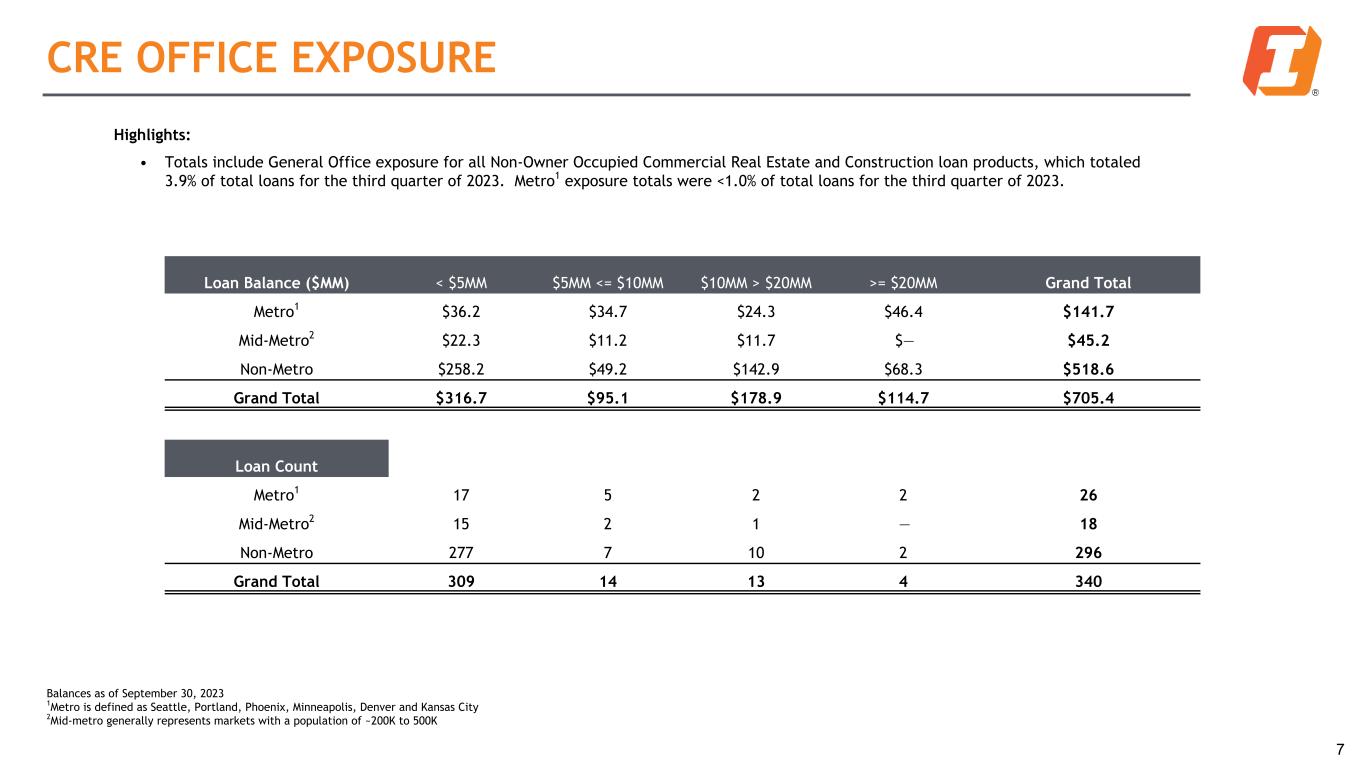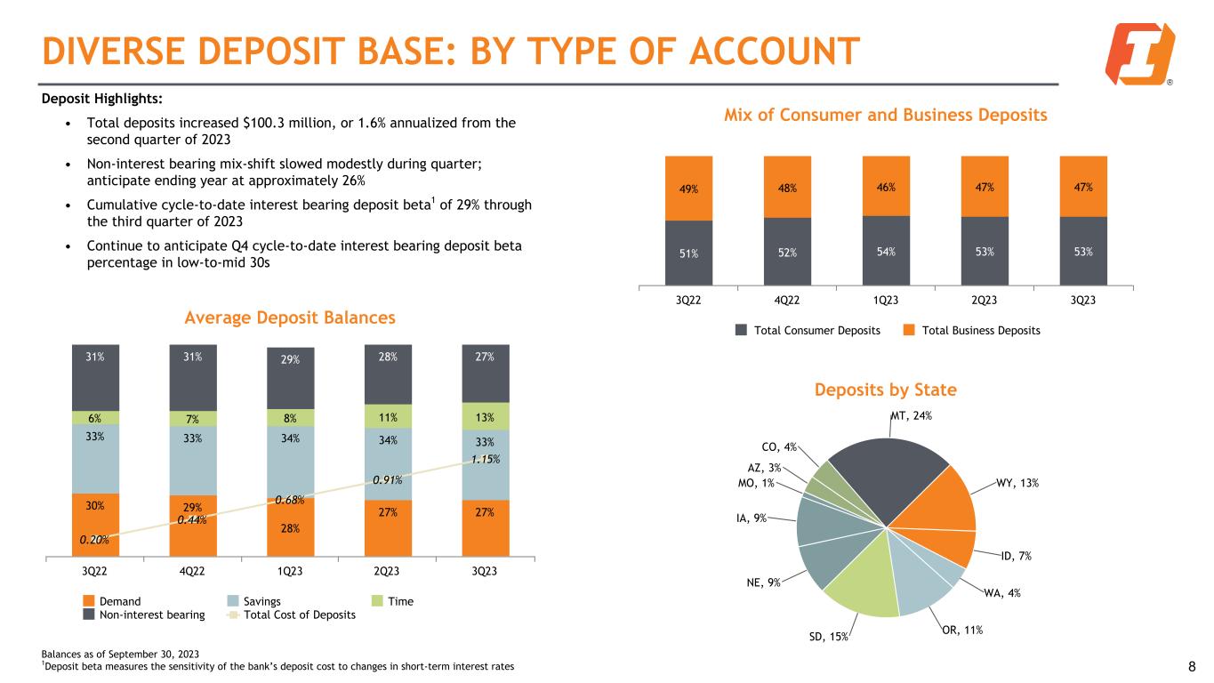 DIVERSIFIED LOAN PORTFOLIO Loans Held for Investment Commercial RE, 48% Construction RE, 11% Residential RE, 12% Agriculture RE, 4% Consumer, 5%Commercial, 16% Agriculture, 4% Loans by Geography MT, 15% WY, 4% ID, 5% WA, 8% OR, 9% SD, 10%ND, 2% NE, 6% IA, 10% KS, 2% AZ, 6% CO, 7% Other, 16% Revolving Commitments ($MM) $3.2 $3.2 $3.2 $3.1 $3.1 37.1% 36.8% 37.1% 37.1% 36.8% Unfunded Funded 3Q22 4Q22 1Q23 2Q23 3Q23 6 Loan Highlights: • Loans declined $50.1 million during the third quarter of 2023, or 1.2% annualized • Company continues to remain focused on relationship-based lending with strong risk-adjusted returns • Non-revolving unfunded commitments of $1.3 billion for the third quarter of 2023 • Commercial real estate (RE) commitments are 33.9% owner- occupied for the third quarter of 2023 $18.2B Balances as of September 30, 2023
