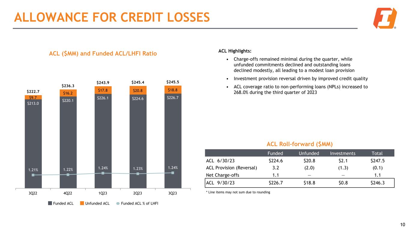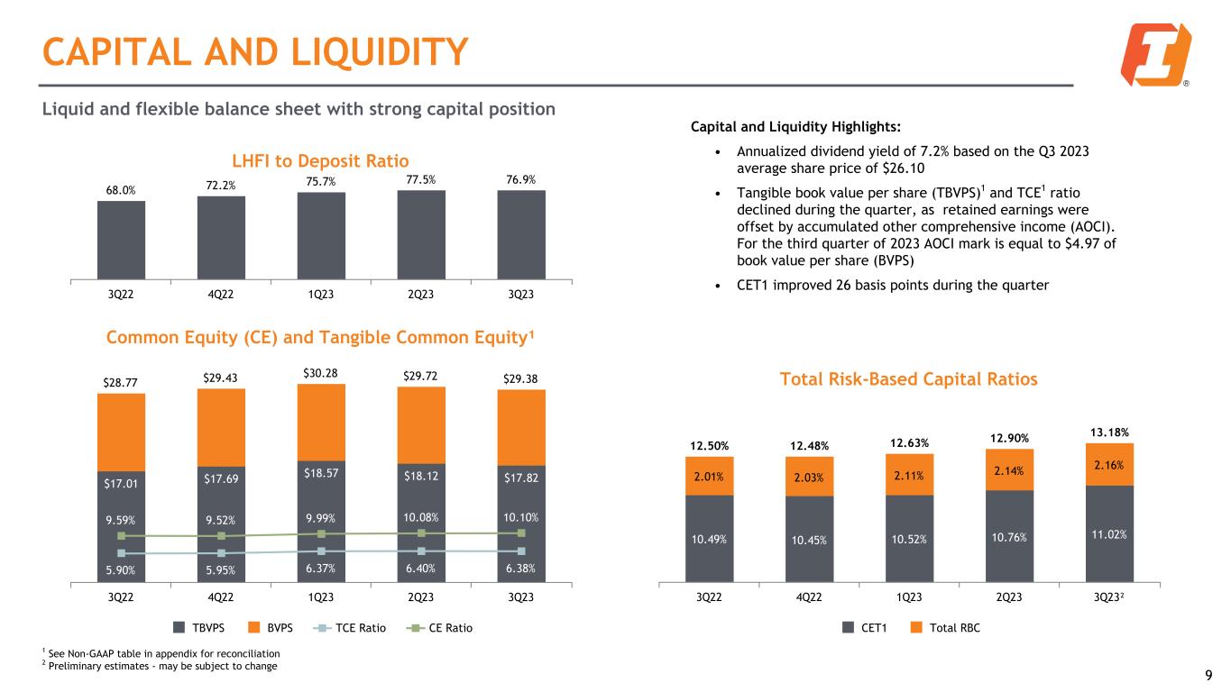 Total Risk-Based Capital Ratios 12.50% 12.48% 12.63% 12.90% 13.18% 10.49% 10.45% 10.52% 10.76% 11.02% 2.01% 2.03% 2.11% 2.14% 2.16% CET1 Total RBC 3Q22 4Q22 1Q23 2Q23 3Q23² CAPITAL AND LIQUIDITY Liquid and flexible balance sheet with strong capital position Common Equity (CE) and Tangible Common Equity¹ $28.77 $29.43 $30.28 $29.72 $29.38 $17.01 $17.69 $18.57 $18.12 $17.82 5.90% 5.95% 6.37% 6.40% 6.38% 9.59% 9.52% 9.99% 10.08% 10.10% TBVPS BVPS TCE Ratio CE Ratio 3Q22 4Q22 1Q23 2Q23 3Q23 9 LHFI to Deposit Ratio 68.0% 72.2% 75.7% 77.5% 76.9% 3Q22 4Q22 1Q23 2Q23 3Q23 1 See Non-GAAP table in appendix for reconciliation 2 Preliminary estimates - may be subject to change Capital and Liquidity Highlights: • Annualized dividend yield of 7.2% based on the Q3 2023 average share price of $26.10 • Tangible book value per share (TBVPS)1 and TCE1 ratio declined during the quarter, as retained earnings were offset by accumulated other comprehensive income (AOCI). For the third quarter of 2023 AOCI mark is equal to $4.97 of book value per share (BVPS) • CET1 improved 26 basis points during the quarter