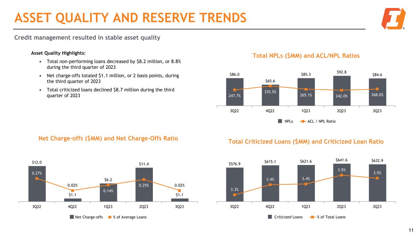 ALLOWANCE FOR CREDIT LOSSES ACL ($MM) and Funded ACL/LHFI Ratio $222.7 $236.3 $243.9 $245.4 $245.5 $213.0 $220.1 $226.1 $224.6 $226.7$9.7 $16.2 $17.8 $20.8 $18.8 1.21% 1.22% 1.24% 1.23% 1.24% Funded ACL Unfunded ACL Funded ACL % of LHFI 3Q22 4Q22 1Q23 2Q23 3Q23 10 ACL Roll-forward ($MM) Funded Unfunded Investments Total ACL 6/30/23 $224.6 $20.8 $2.1 $247.5 ACL Provision (Reversal) 3.2 (2.0) (1.3) (0.1) Net Charge-offs 1.1 — — 1.1 ACL 9/30/23 $226.7 $18.8 $0.8 $246.3 * Line items may not sum due to rounding ACL Highlights: • Charge-offs remained minimal during the quarter, while unfunded commitments declined and outstanding loans declined modestly, all leading to a modest loan provision • Investment provision reversal driven by improved credit quality • ACL coverage ratio to non-performing loans (NPLs) increased to 268.0% during the third quarter of 2023