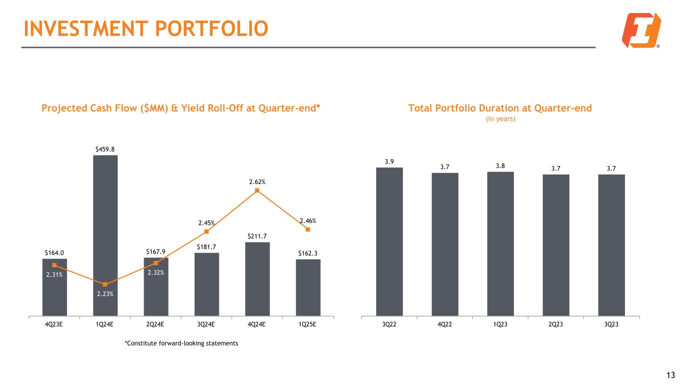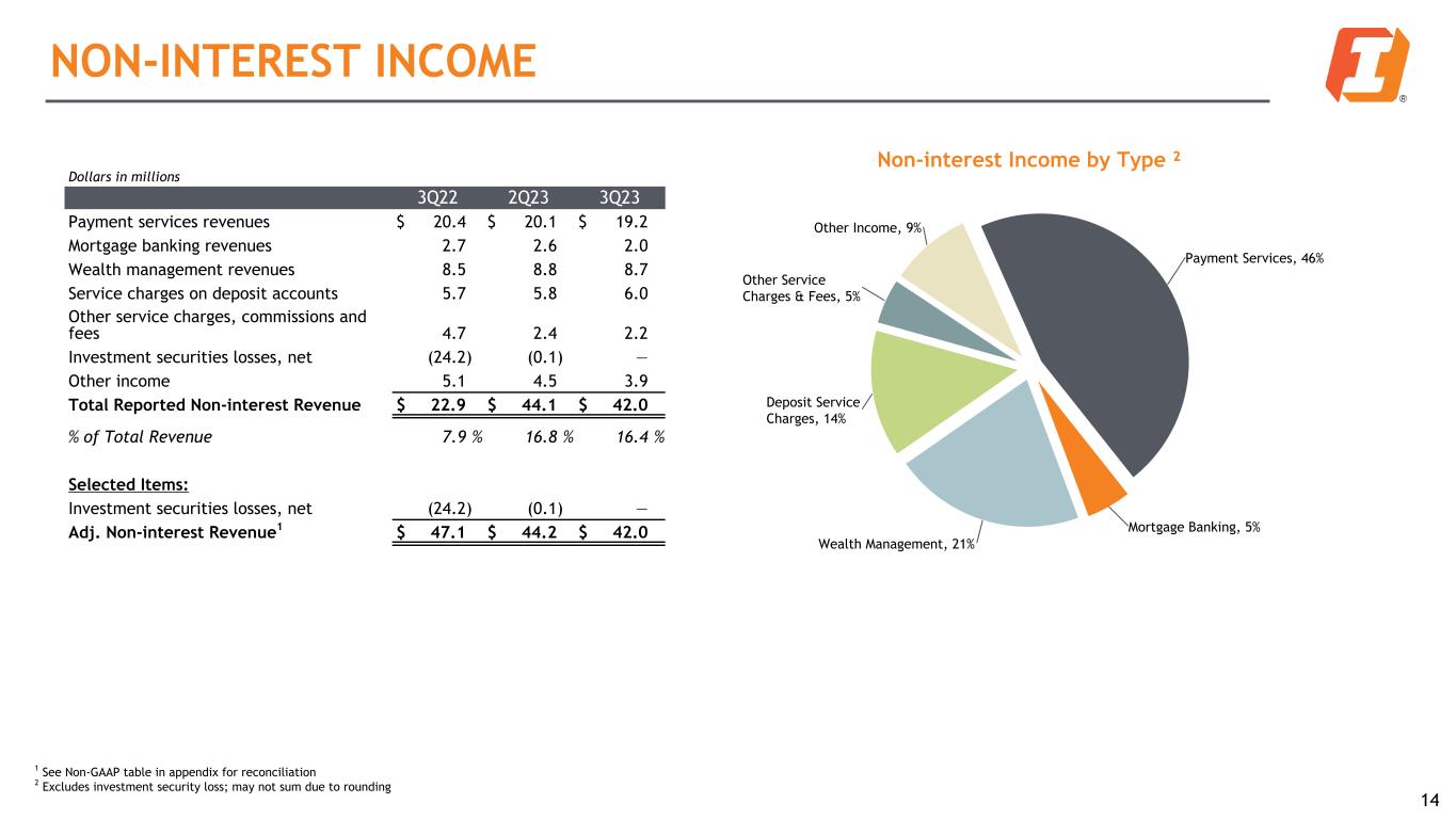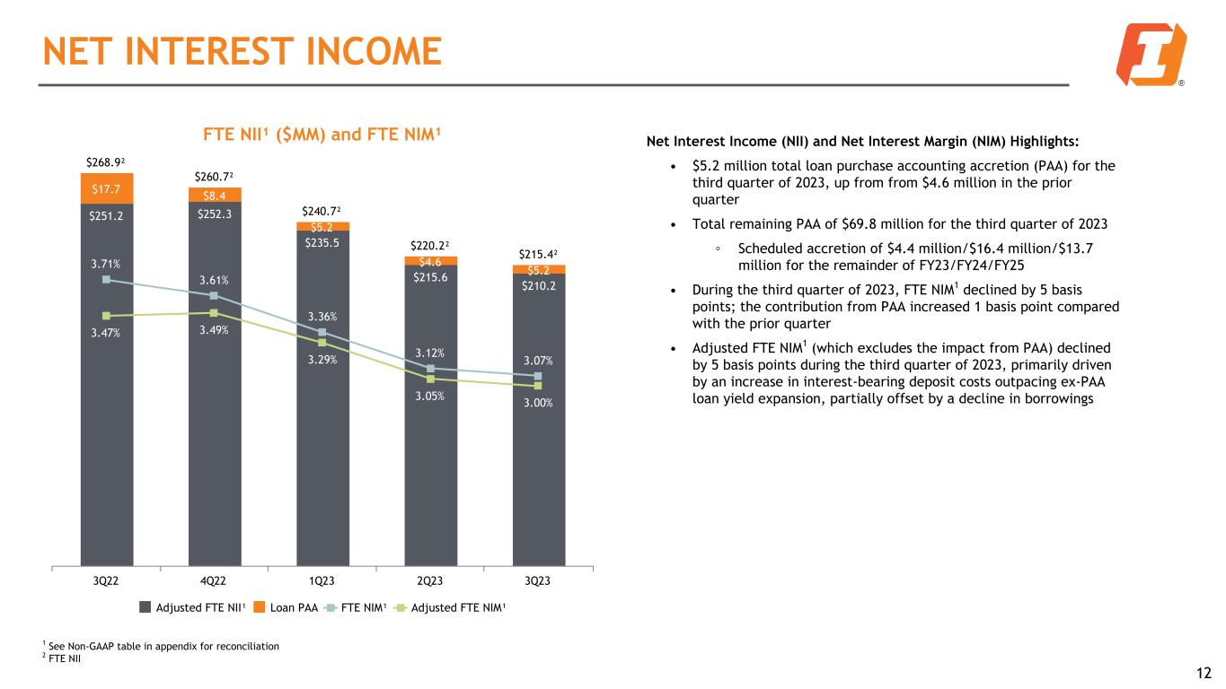 NET INTEREST INCOME FTE NII¹ ($MM) and FTE NIM¹ $251.2 $252.3 $235.5 $215.6 $210.2 $17.7 $8.4 $5.2 $4.6 $5.2 $268.9² $260.7² $240.7² $220.2² $215.4² 3.71% 3.61% 3.36% 3.12% 3.07% 3.47% 3.49% 3.29% 3.05% 3.00% Adjusted FTE NII¹ Loan PAA FTE NIM¹ Adjusted FTE NIM¹ 3Q22 4Q22 1Q23 2Q23 3Q23 12 1 See Non-GAAP table in appendix for reconciliation 2 FTE NII Net Interest Income (NII) and Net Interest Margin (NIM) Highlights: • $5.2 million total loan purchase accounting accretion (PAA) for the third quarter of 2023, up from from $4.6 million in the prior quarter • Total remaining PAA of $69.8 million for the third quarter of 2023 ◦ Scheduled accretion of $4.4 million/$16.4 million/$13.7 million for the remainder of FY23/FY24/FY25 • During the third quarter of 2023, FTE NIM1 declined by 5 basis points; the contribution from PAA increased 1 basis point compared with the prior quarter • Adjusted FTE NIM1 (which excludes the impact from PAA) declined by 5 basis points during the third quarter of 2023, primarily driven by an increase in interest-bearing deposit costs outpacing ex-PAA loan yield expansion, partially offset by a decline in borrowings