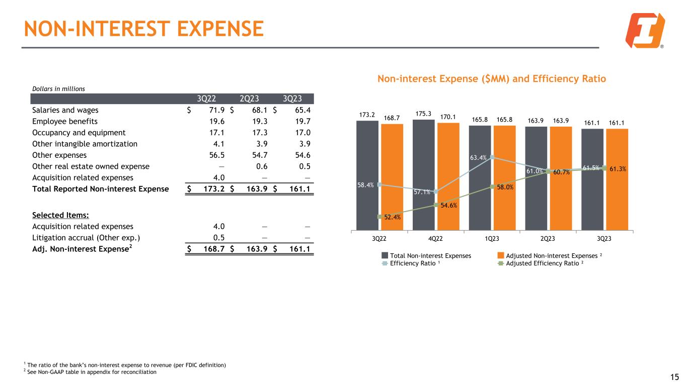 14 Non-interest Income by Type ² Payment Services, 46% Mortgage Banking, 5% Wealth Management, 21% Deposit Service Charges, 14% Other Service Charges & Fees, 5% Other Income, 9% Dollars in millions 3Q22 2Q23 3Q23 Payment services revenues $ 20.4 $ 20.1 $ 19.2 Mortgage banking revenues 2.7 2.6 2.0 Wealth management revenues 8.5 8.8 8.7 Service charges on deposit accounts 5.7 5.8 6.0 Other service charges, commissions and fees 4.7 2.4 2.2 Investment securities losses, net (24.2) (0.1) — Other income 5.1 4.5 3.9 Total Reported Non-interest Revenue $ 22.9 $ 44.1 $ 42.0 % of Total Revenue 7.9 % 16.8 % 16.4 % Selected Items: Investment securities losses, net (24.2) (0.1) — Adj. Non-interest Revenue1 $ 47.1 $ 44.2 $ 42.0 NON-INTEREST INCOME 1 See Non-GAAP table in appendix for reconciliation 2 Excludes investment security loss; may not sum due to rounding