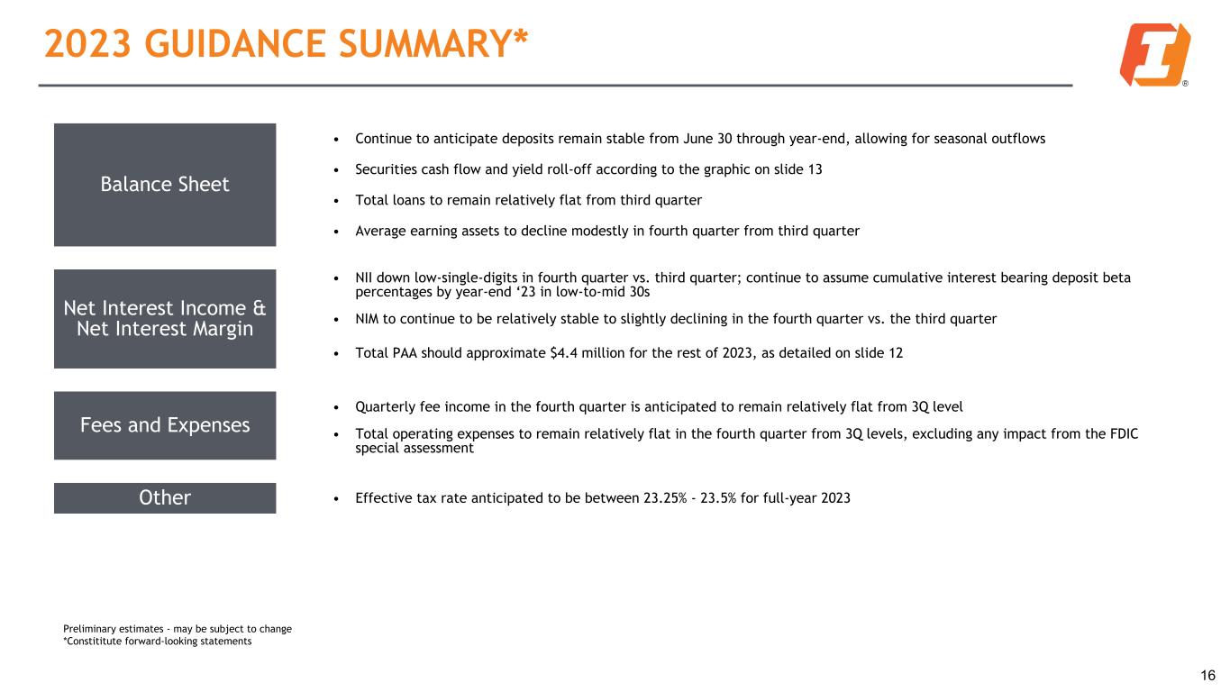 NON-INTEREST EXPENSE 15 Dollars in millions 3Q22 2Q23 3Q23 Salaries and wages $ 71.9 $ 68.1 $ 65.4 Employee benefits 19.6 19.3 19.7 Occupancy and equipment 17.1 17.3 17.0 Other intangible amortization 4.1 3.9 3.9 Other expenses 56.5 54.7 54.6 Other real estate owned expense — 0.6 0.5 Acquisition related expenses 4.0 — — Total Reported Non-interest Expense $ 173.2 $ 163.9 $ 161.1 Selected Items: Acquisition related expenses 4.0 — — Litigation accrual (Other exp.) 0.5 — — Adj. Non-interest Expense2 $ 168.7 $ 163.9 $ 161.1 Non-interest Expense ($MM) and Efficiency Ratio 173.2 175.3 165.8 163.9 161.1 168.7 170.1 165.8 163.9 161.1 58.4% 57.1% 63.4% 61.0% 61.5% 52.4% 54.6% 58.0% 60.7% 61.3% Total Non-interest Expenses Adjusted Non-interest Expenses ² Efficiency Ratio ¹ Adjusted Efficiency Ratio ² 3Q22 4Q22 1Q23 2Q23 3Q23 1 The ratio of the bank’s non-interest expense to revenue (per FDIC definition) 2 See Non-GAAP table in appendix for reconciliation