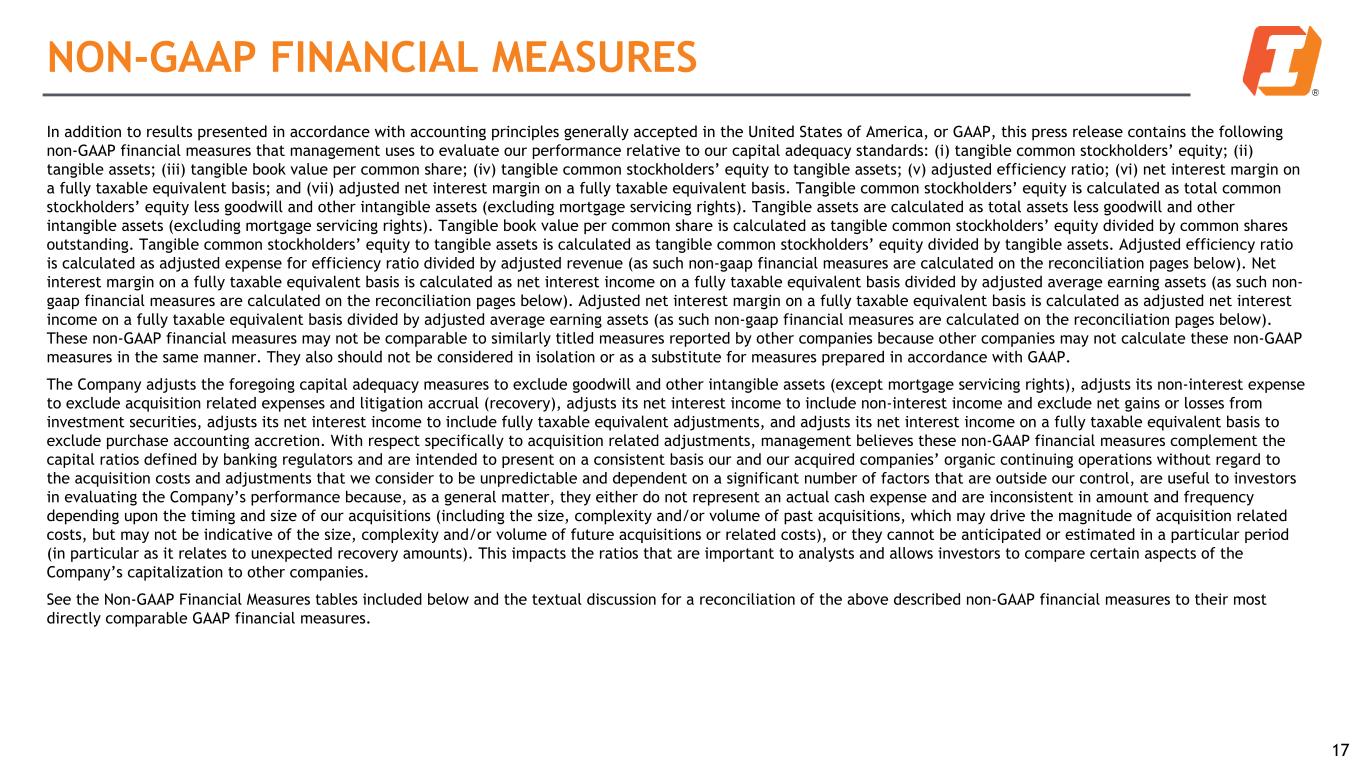 NON-GAAP FINANCIAL MEASURES 17 In addition to results presented in accordance with accounting principles generally accepted in the United States of America, or GAAP, this press release contains the following non-GAAP financial measures that management uses to evaluate our performance relative to our capital adequacy standards: (i) tangible common stockholders’ equity; (ii) tangible assets; (iii) tangible book value per common share; (iv) tangible common stockholders’ equity to tangible assets; (v) adjusted efficiency ratio; (vi) net interest margin on a fully taxable equivalent basis; and (vii) adjusted net interest margin on a fully taxable equivalent basis. Tangible common stockholders’ equity is calculated as total common stockholders’ equity less goodwill and other intangible assets (excluding mortgage servicing rights). Tangible assets are calculated as total assets less goodwill and other intangible assets (excluding mortgage servicing rights). Tangible book value per common share is calculated as tangible common stockholders’ equity divided by common shares outstanding. Tangible common stockholders’ equity to tangible assets is calculated as tangible common stockholders’ equity divided by tangible assets. Adjusted efficiency ratio is calculated as adjusted expense for efficiency ratio divided by adjusted revenue (as such non-gaap financial measures are calculated on the reconciliation pages below). Net interest margin on a fully taxable equivalent basis is calculated as net interest income on a fully taxable equivalent basis divided by adjusted average earning assets (as such non- gaap financial measures are calculated on the reconciliation pages below). Adjusted net interest margin on a fully taxable equivalent basis is calculated as adjusted net interest income on a fully taxable equivalent basis divided by adjusted average earning assets (as such non-gaap financial measures are calculated on the reconciliation pages below). These non-GAAP financial measures may not be comparable to similarly titled measures reported by other companies because other companies may not calculate these non-GAAP measures in the same manner. They also should not be considered in isolation or as a substitute for measures prepared in accordance with GAAP. The Company adjusts the foregoing capital adequacy measures to exclude goodwill and other intangible assets (except mortgage servicing rights), adjusts its non-interest expense to exclude acquisition related expenses and litigation accrual (recovery), adjusts its net interest income to include non-interest income and exclude net gains or losses from investment securities, adjusts its net interest income to include fully taxable equivalent adjustments, and adjusts its net interest income on a fully taxable equivalent basis to exclude purchase accounting accretion. With respect specifically to acquisition related adjustments, management believes these non-GAAP financial measures complement the capital ratios defined by banking regulators and are intended to present on a consistent basis our and our acquired companies’ organic continuing operations without regard to the acquisition costs and adjustments that we consider to be unpredictable and dependent on a significant number of factors that are outside our control, are useful to investors in evaluating the Company’s performance because, as a general matter, they either do not represent an actual cash expense and are inconsistent in amount and frequency depending upon the timing and size of our acquisitions (including the size, complexity and/or volume of past acquisitions, which may drive the magnitude of acquisition related costs, but may not be indicative of the size, complexity and/or volume of future acquisitions or related costs), or they cannot be anticipated or estimated in a particular period (in particular as it relates to unexpected recovery amounts). This impacts the ratios that are important to analysts and allows investors to compare certain aspects of the Company’s capitalization to other companies. See the Non-GAAP Financial Measures tables included below and the textual discussion for a reconciliation of the above described non-GAAP financial measures to their most directly comparable GAAP financial measures.