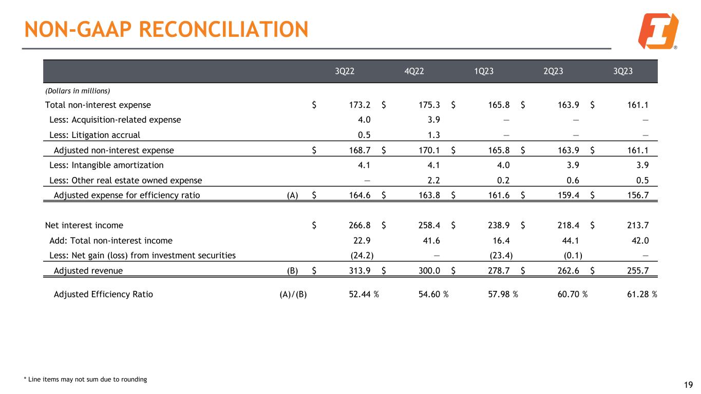 3Q22 4Q22 1Q23 2Q23 3Q23 (Dollars in millions) Total common stockholders' equity (GAAP) (A) $ 3,005.5 $ 3,073.8 $ 3,160.3 $ 3,121.2 $ 3,085.5 Less goodwill and other intangible assets (excluding mortgage servicing rights) 1,229.0 1,225.9 1,221.9 1,218.0 1,214.1 Tangible common stockholders' equity (Non-GAAP) (B) $ 1,776.5 $ 1,847.9 $ 1,938.4 $ 1,903.2 $ 1,871.4 Total assets (GAAP) $ 31,344.7 $ 32,287.8 $ 31,637.7 $ 30,976.3 $ 30,540.8 Less goodwill and other intangible assets (excluding mortgage servicing rights) 1,229.0 1,225.9 1,221.9 1,218.0 1,214.1 Tangible assets (Non-GAAP) (C) $ 30,115.7 $ 31,061.9 $ 30,415.8 $ 29,758.3 $ 29,326.7 Common shares outstanding (L) 104,451 104,442 104,382 105,021 105,011 Book value per common share (GAAP) (A) / (L) $ 28.77 $ 29.43 $ 30.28 $ 29.72 $ 29.38 Tangible book value per common share (Non-GAAP) (B) / (L) 17.01 17.69 18.57 18.12 17.82 Tangible common stockholders' equity to tangible assets (Non-GAAP) (B) / (C) 5.90 % 5.95 % 6.37 % 6.40 % 6.38 % NON-GAAP RECONCILIATION 18 * Line items may not sum due to rounding