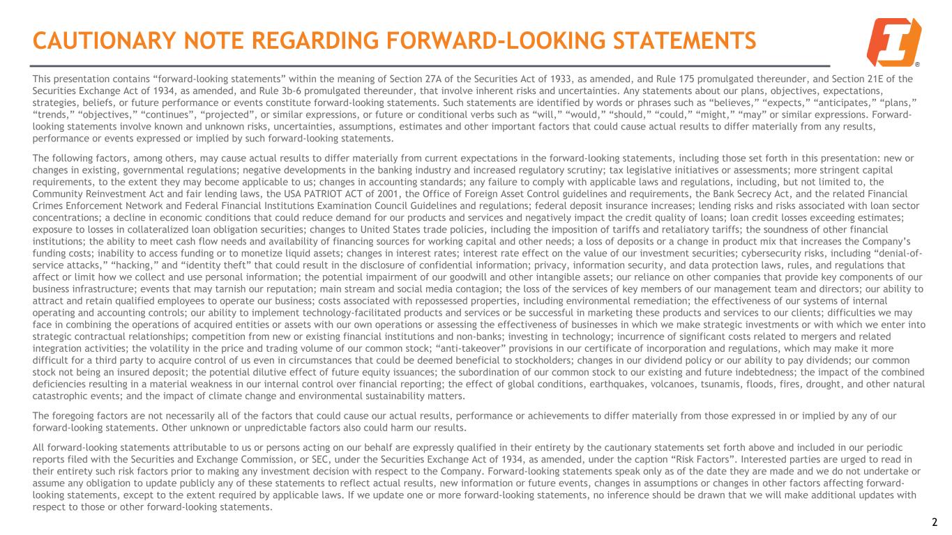 CAUTIONARY NOTE REGARDING FORWARD-LOOKING STATEMENTS This presentation contains “forward-looking statements” within the meaning of Section 27A of the Securities Act of 1933, as amended, and Rule 175 promulgated thereunder, and Section 21E of the Securities Exchange Act of 1934, as amended, and Rule 3b-6 promulgated thereunder, that involve inherent risks and uncertainties. Any statements about our plans, objectives, expectations, strategies, beliefs, or future performance or events constitute forward-looking statements. Such statements are identified by words or phrases such as “believes,” “expects,” “anticipates,” “plans,” “trends,” “objectives,” “continues”, “projected”, or similar expressions, or future or conditional verbs such as “will,” “would,” “should,” “could,” “might,” “may” or similar expressions. Forward- looking statements involve known and unknown risks, uncertainties, assumptions, estimates and other important factors that could cause actual results to differ materially from any results, performance or events expressed or implied by such forward-looking statements. The following factors, among others, may cause actual results to differ materially from current expectations in the forward-looking statements, including those set forth in this presentation: new or changes in existing, governmental regulations; negative developments in the banking industry and increased regulatory scrutiny; tax legislative initiatives or assessments; more stringent capital requirements, to the extent they may become applicable to us; changes in accounting standards; any failure to comply with applicable laws and regulations, including, but not limited to, the Community Reinvestment Act and fair lending laws, the USA PATRIOT ACT of 2001, the Office of Foreign Asset Control guidelines and requirements, the Bank Secrecy Act, and the related Financial Crimes Enforcement Network and Federal Financial Institutions Examination Council Guidelines and regulations; federal deposit insurance increases; lending risks and risks associated with loan sector concentrations; a decline in economic conditions that could reduce demand for our products and services and negatively impact the credit quality of loans; loan credit losses exceeding estimates; exposure to losses in collateralized loan obligation securities; changes to United States trade policies, including the imposition of tariffs and retaliatory tariffs; the soundness of other financial institutions; the ability to meet cash flow needs and availability of financing sources for working capital and other needs; a loss of deposits or a change in product mix that increases the Company’s funding costs; inability to access funding or to monetize liquid assets; changes in interest rates; interest rate effect on the value of our investment securities; cybersecurity risks, including “denial-of- service attacks,” “hacking,” and “identity theft” that could result in the disclosure of confidential information; privacy, information security, and data protection laws, rules, and regulations that affect or limit how we collect and use personal information; the potential impairment of our goodwill and other intangible assets; our reliance on other companies that provide key components of our business infrastructure; events that may tarnish our reputation; main stream and social media contagion; the loss of the services of key members of our management team and directors; our ability to attract and retain qualified employees to operate our business; costs associated with repossessed properties, including environmental remediation; the effectiveness of our systems of internal operating and accounting controls; our ability to implement technology-facilitated products and services or be successful in marketing these products and services to our clients; difficulties we may face in combining the operations of acquired entities or assets with our own operations or assessing the effectiveness of businesses in which we make strategic investments or with which we enter into strategic contractual relationships; competition from new or existing financial institutions and non-banks; investing in technology; incurrence of significant costs related to mergers and related integration activities; the volatility in the price and trading volume of our common stock; “anti-takeover” provisions in our certificate of incorporation and regulations, which may make it more difficult for a third party to acquire control of us even in circumstances that could be deemed beneficial to stockholders; changes in our dividend policy or our ability to pay dividends; our common stock not being an insured deposit; the potential dilutive effect of future equity issuances; the subordination of our common stock to our existing and future indebtedness; the impact of the combined deficiencies resulting in a material weakness in our internal control over financial reporting; the effect of global conditions, earthquakes, volcanoes, tsunamis, floods, fires, drought, and other natural catastrophic events; and the impact of climate change and environmental sustainability matters. The foregoing factors are not necessarily all of the factors that could cause our actual results, performance or achievements to differ materially from those expressed in or implied by any of our forward-looking statements. Other unknown or unpredictable factors also could harm our results. All forward-looking statements attributable to us or persons acting on our behalf are expressly qualified in their entirety by the cautionary statements set forth above and included in our periodic reports filed with the Securities and Exchange Commission, or SEC, under the Securities Exchange Act of 1934, as amended, under the caption “Risk Factors”. Interested parties are urged to read in their entirety such risk factors prior to making any investment decision with re