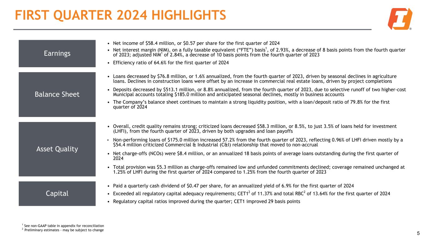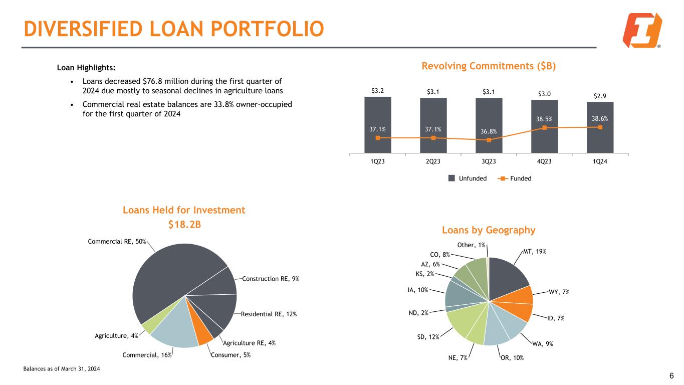 Earnings • Net income of $58.4 million, or $0.57 per share for the first quarter of 2024 • Net interest margin (NIM), on a fully taxable equivalent (“FTE”) basis1, of 2.93%, a decrease of 8 basis points from the fourth quarter of 2023; adjusted NIM1 of 2.84%, a decrease of 10 basis points from the fourth quarter of 2023 • Efficiency ratio of 64.6% for the first quarter of 2024 Balance Sheet • Loans decreased by $76.8 million, or 1.6% annualized, from the fourth quarter of 2023, driven by seasonal declines in agriculture loans. Declines in construction loans were offset by an increase in commercial real estate loans, driven by project completions • Deposits decreased by $513.1 million, or 8.8% annualized, from the fourth quarter of 2023, due to selective runoff of two higher-cost Municipal accounts totaling $185.0 million and anticipated seasonal declines, mostly in business accounts • The Company’s balance sheet continues to maintain a strong liquidity position, with a loan/deposit ratio of 79.8% for the first quarter of 2024 Asset Quality • Overall, credit quality remains strong; criticized loans decreased $58.3 million, or 8.5%, to just 3.5% of loans held for investment (LHFI), from the fourth quarter of 2023, driven by both upgrades and loan payoffs • Non-performing loans of $175.0 million increased 57.2% from the fourth quarter of 2023, reflecting 0.96% of LHFI driven mostly by a $54.4 million criticized Commercial & Industrial (C&I) relationship that moved to non-accrual • Net charge-offs (NCOs) were $8.4 million, or an annualized 18 basis points of average loans outstanding during the first quarter of 2024 • Total provision was $5.3 million as charge-offs remained low and unfunded commitments declined; coverage remained unchanged at 1.25% of LHFI during the first quarter of 2024 compared to 1.25% from the fourth quarter of 2023 Capital • Paid a quarterly cash dividend of $0.47 per share, for an annualized yield of 6.9% for the first quarter of 2024 • Exceeded all regulatory capital adequacy requirements; CET12 of 11.37% and total RBC2 of 13.64% for the first quarter of 2024 • Regulatory capital ratios improved during the quarter; CET1 improved 29 basis points FIRST QUARTER 2024 HIGHLIGHTS 5 1 See non-GAAP table in appendix for reconciliation 2 Preliminary estimates - may be subject to change