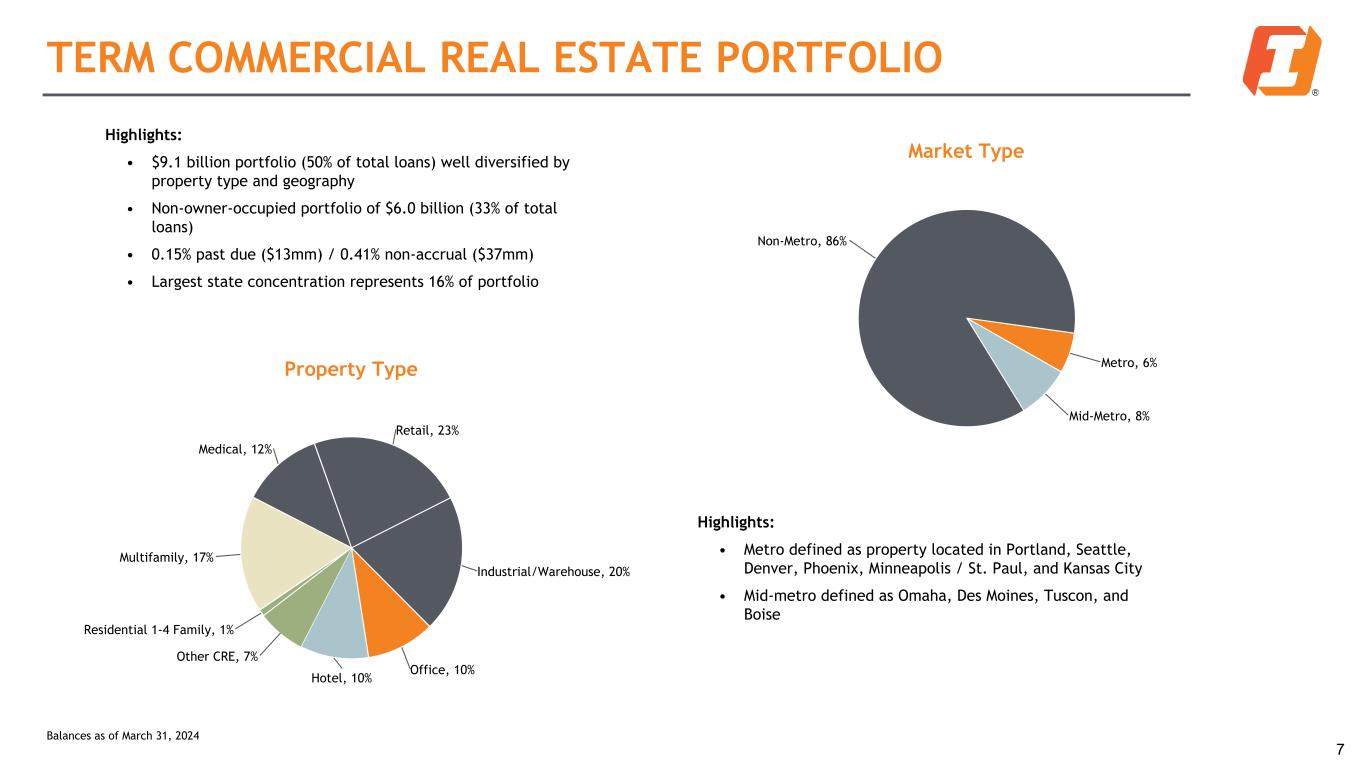 DIVERSIFIED LOAN PORTFOLIO Loans Held for Investment Commercial RE, 50% Construction RE, 9% Residential RE, 12% Agriculture RE, 4% Consumer, 5%Commercial, 16% Agriculture, 4% Loans by Geography MT, 19% WY, 7% ID, 7% WA, 9% OR, 10%NE, 7% SD, 12% ND, 2% IA, 10% KS, 2% AZ, 6% CO, 8% Other, 1% Revolving Commitments ($B) $3.2 $3.1 $3.1 $3.0 $2.9 37.1% 37.1% 36.8% 38.5% 38.6% Unfunded Funded 1Q23 2Q23 3Q23 4Q23 1Q24 6 Loan Highlights: • Loans decreased $76.8 million during the first quarter of 2024 due mostly to seasonal declines in agriculture loans • Commercial real estate balances are 33.8% owner-occupied for the first quarter of 2024 $18.2B Balances as of March 31, 2024