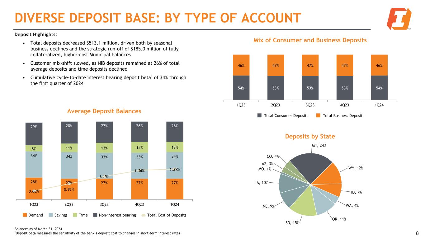 TERM COMMERCIAL REAL ESTATE PORTFOLIO Property Type Multifamily, 17% Medical, 12% Retail, 23% Industrial/Warehouse, 20% Office, 10% Hotel, 10% Other CRE, 7% Residential 1-4 Family, 1% Market Type Metro, 6% Mid-Metro, 8% Non-Metro, 86% 7 Highlights: • $9.1 billion portfolio (50% of total loans) well diversified by property type and geography • Non-owner-occupied portfolio of $6.0 billion (33% of total loans) • 0.15% past due ($13mm) / 0.41% non-accrual ($37mm) • Largest state concentration represents 16% of portfolio Balances as of March 31, 2024 Highlights: • Metro defined as property located in Portland, Seattle, Denver, Phoenix, Minneapolis / St. Paul, and Kansas City • Mid-metro defined as Omaha, Des Moines, Tuscon, and Boise