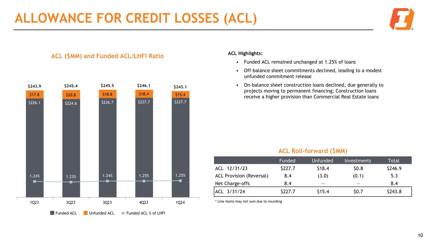 Total Risk-Based Capital Ratios 12.63% 12.90% 13.19% 13.28% 13.64% 10.52% 10.76% 11.02% 11.08% 11.37% 2.11% 2.14% 2.17% 2.20% 2.27% CET1 Total RBC 1Q23 2Q23 3Q23 4Q23 1Q24² CAPITAL AND LIQUIDITY Liquid and flexible balance sheet with strong capital position Common Equity (CE) and Tangible Common Equity (TCE)¹ $30.28 $29.72 $29.38 $31.05 $30.69 $18.57 $18.12 $17.82 $19.41 $19.16 6.37% 6.40% 6.38% 6.85% 6.92% 9.99% 10.08% 10.10% 10.52% 10.65% TBVPS BVPS TCE Ratio CE Ratio 1Q23 2Q23 3Q23 4Q23 1Q24 9 LHFI to Deposit Ratio 75.7% 77.5% 76.9% 78.4% 79.8% 1Q23 2Q23 3Q23 4Q23 1Q24 1 See Non-GAAP table in appendix for reconciliation 2 Preliminary estimates - may be subject to change Capital and Liquidity Highlights: • Annualized dividend yield of 6.9% based on the first quarter of 2024 average share price of $27.30 • Capital ratios increased for fifth consecutive quarter • Tangible book value per share (TBVPS)1 declined modestly during the first quarter, as a slight increase in accumulated other comprehensive income (AOCI) position offset retained earnings. For the first quarter of 2024, the AOCI mark is equal to $3.70 of book value per share (BVPS).